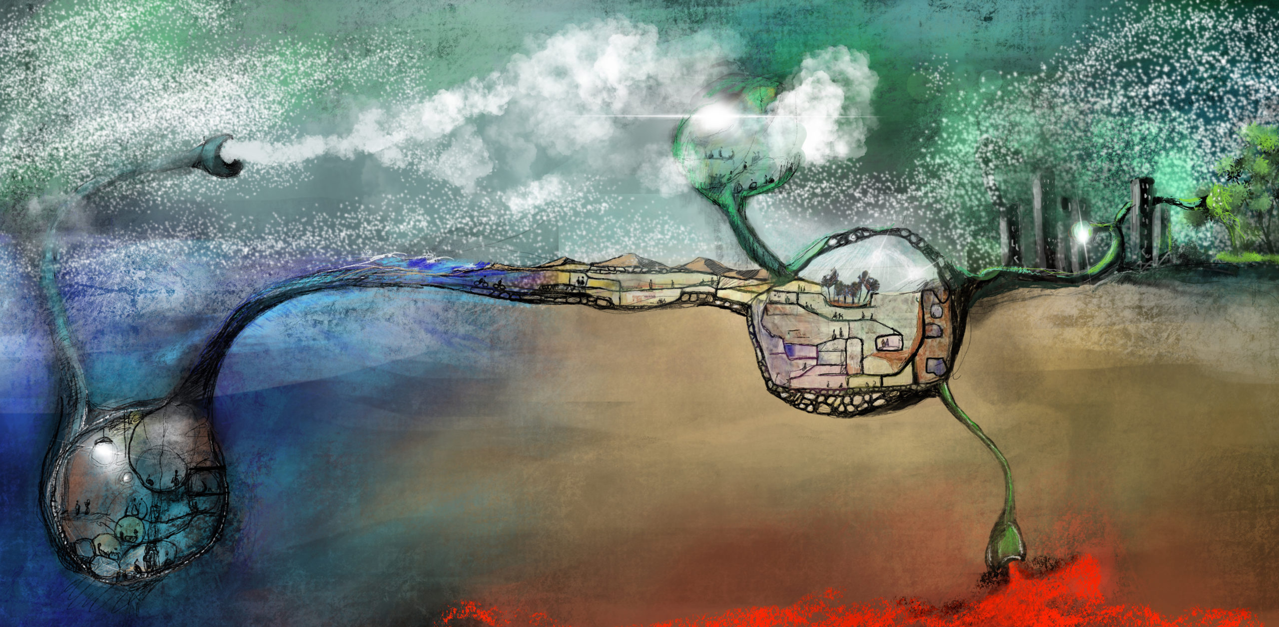 When it grows in the desert it uses Bacillus Pasteurii bacteria to solidify sand so it is an artificial oasis in the dunes. When in the sea it makes shell structures with microalgae diatoms, and using the oxygen it produces. When it floats, it uses Helio in the bubbles of the architectural skin. When it parasites an old city, it uses garbage to grow, recycling materials. Life has changed so much since 2020, and now we live in peace, in this bioarchitecture, living according to our soul, in ecological balance with the whole nature.”