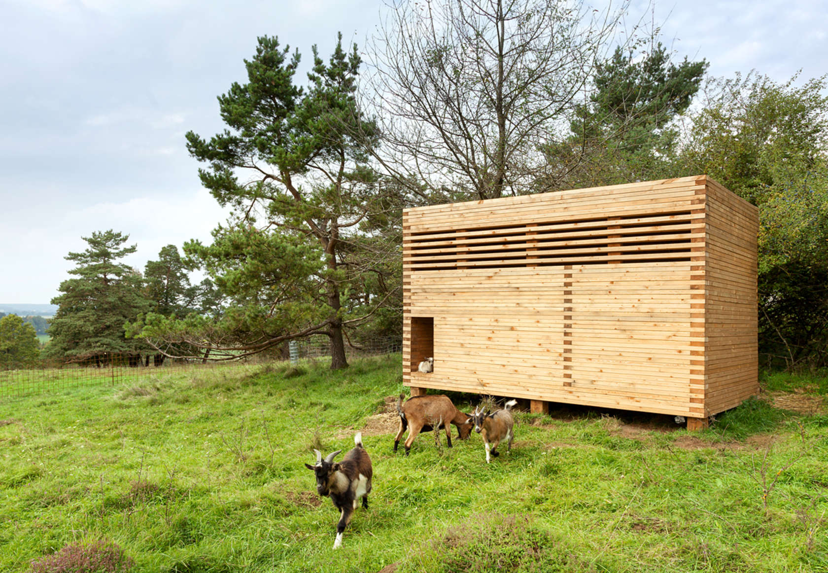 Clad in handsome Western red cedar, this sheep stable features a hay loft that imparts its asymmetrical cross-section.