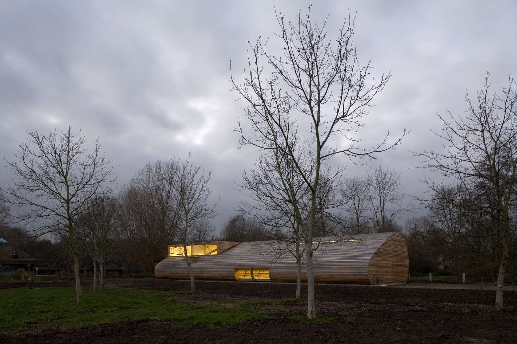 This social healthcare farm is composed of a cow barn, educational spaces, and a care home. Wrapped in a sturdy wooden façade that resembles the surroundings, the building masses fade into the countryside.