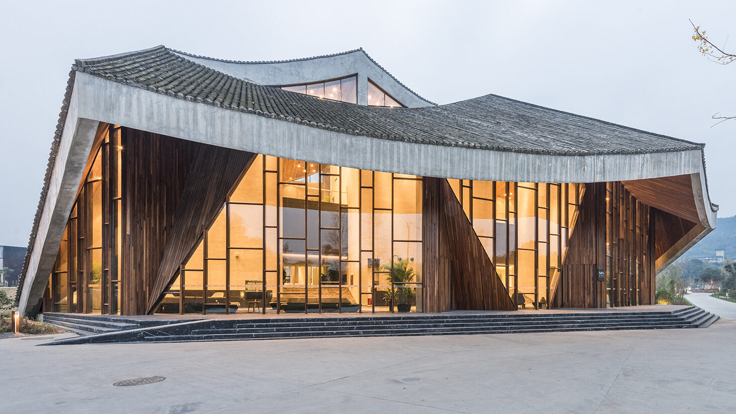 The existing traditional Zhejiang rural architecture of an old farm on the site was preserved, and the new project was designed adjacent to it. The architecture blends traditional techniques and materials with contemporary construction, featuring a single volume with a pitched roof covered in traditional tiles. Four steel boxes disrupt the volume, creating outdoor spaces and intimate alcoves that frame the landscape. The ground floor is constructed with rammed earth for thermal and acoustic insulation, while the second floor uses wood for a lighter, more open feel, with shutters for natural ventilation and views of the surrounding landscape. The roof combines steel and wood to create a high-volume space for public areas, including a large covered terrace with panoramic views.
