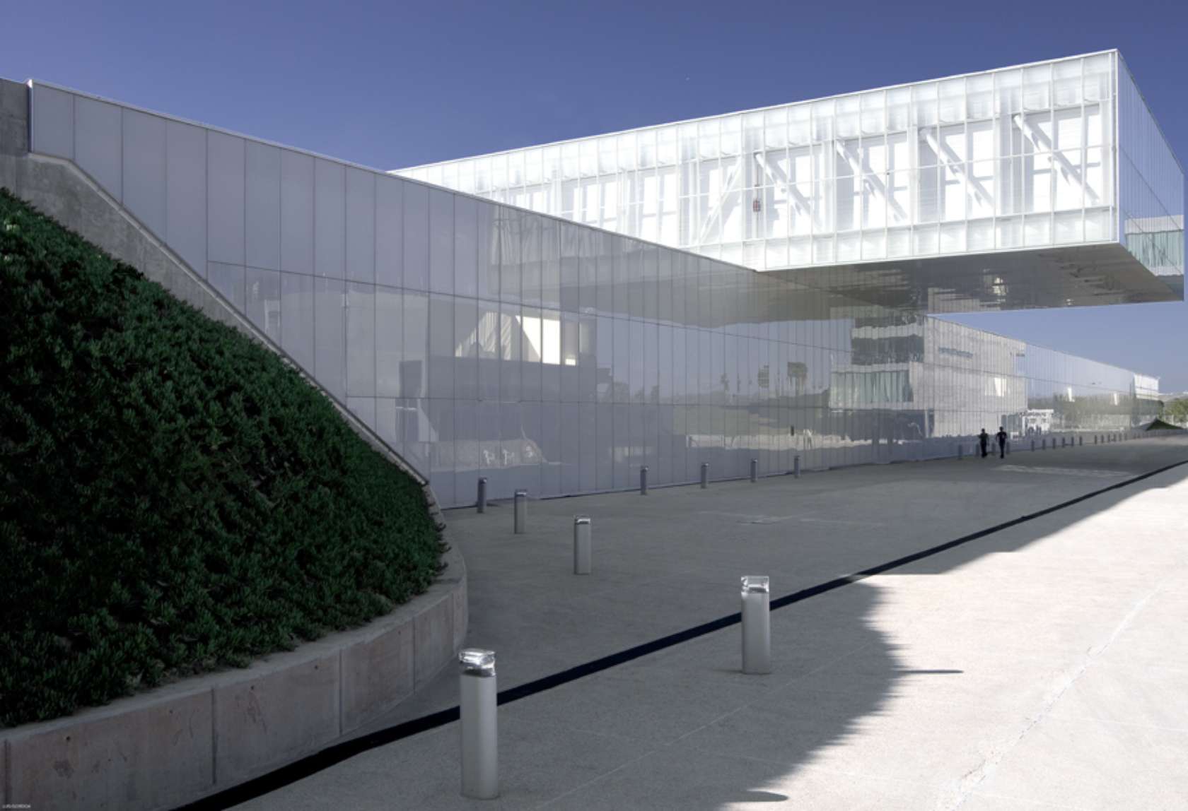 The aluminum façades of this commercial headquarters are faceted to echo giant stone blocks, and their appearance constantly evolves at night with the aid of a multi-chromatic LED lighting system.