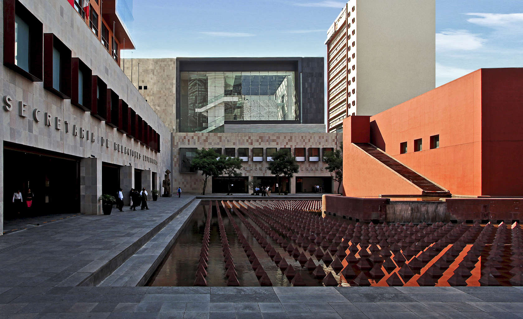 This huge museum complex in Mexico City features a striking sculptural reflecting pool, a soaring seven-story atrium, and an intricately laser-cut cube that houses a permanent memorial.