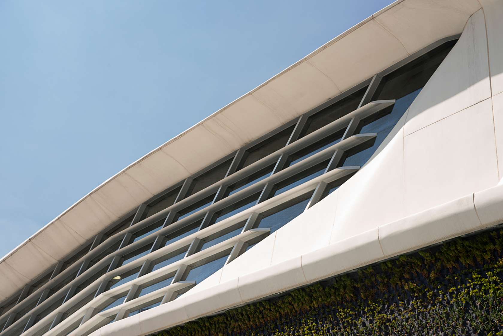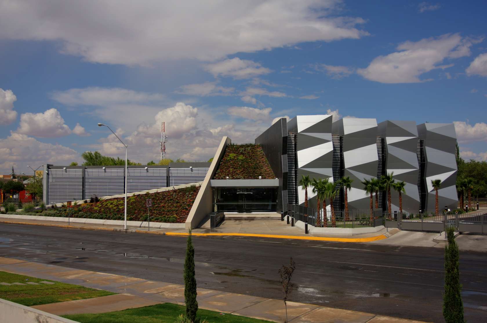 This dynamic, futuristic new retail complex in Santa Fe is notable for its curvaceous façade of glass fiber reinforced panels and its expansive green roof, which includes an 18,568-square-foot orchard.