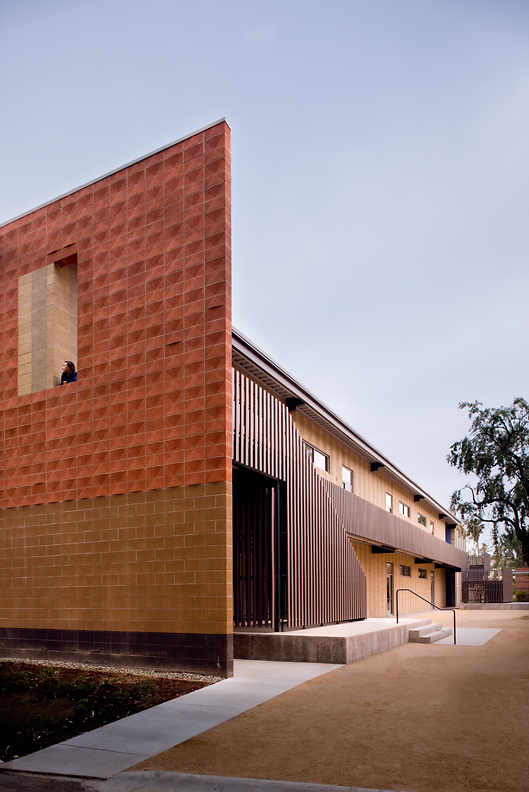 The CMU walls by Sutter support a metal clad roof, while COR-TEN clad metal stud walls are used to further focus views. Veneered plywood and plaster walls articulate veneers at specific surfaces of the exposed CMU walls of the interior spaces. The simple, straightforward masonry details allow for privacy while picking up on specific qualities of the desert landscape.
