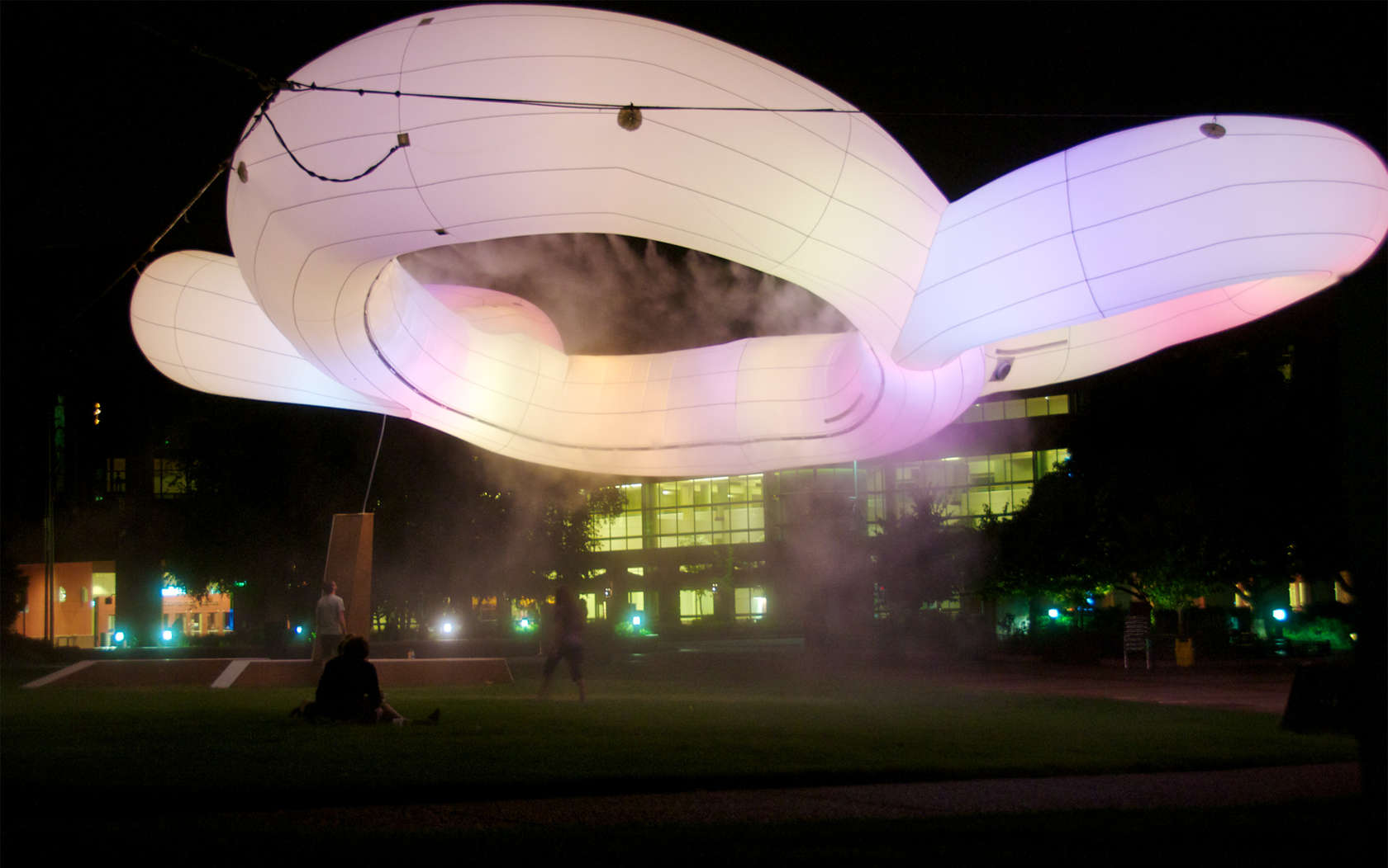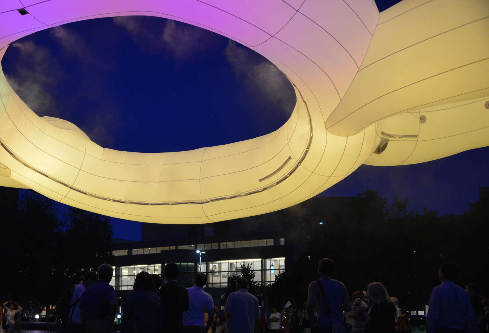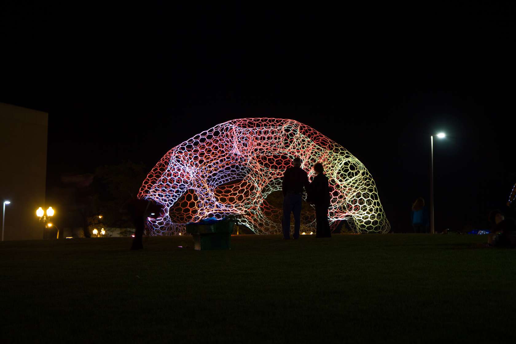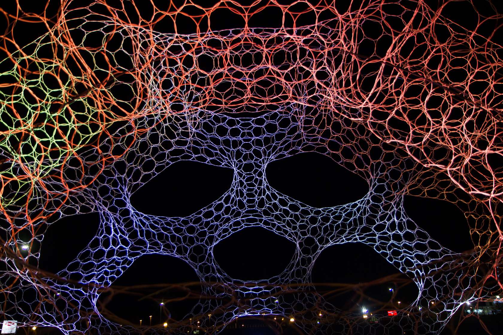 The SOL Dome was fabricated in just three days onsite at the Fall In…Art and Sol celebration of art, culture, and science. Made from thousands of individually woven circles of composite fabric, this new type of architecture responds and adapts to its environment with a responsive circular matrix of solar-powered LED floodlights.
