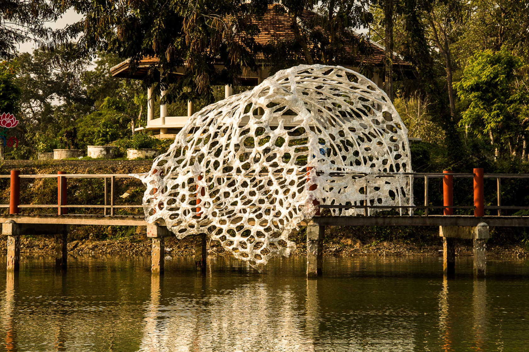 This multidisciplinary installation explores a curiosity for suburban culture in the postmodern era with local crafts. Vinn Chokkhatiwat (architect and designer) and Patararin Pongprasit (fashion designer) realized that plastic had become a part of the true local materials of the present day and chose plastic bottles as the primary material of construction for ‘Self-Ornamentalize.’