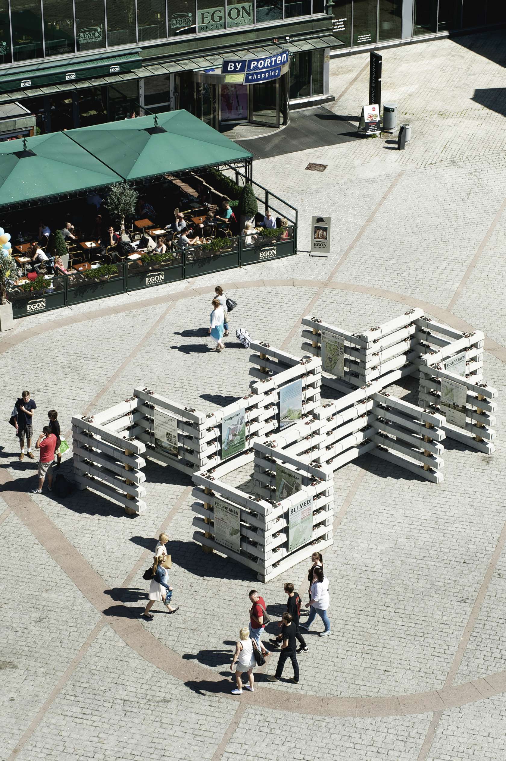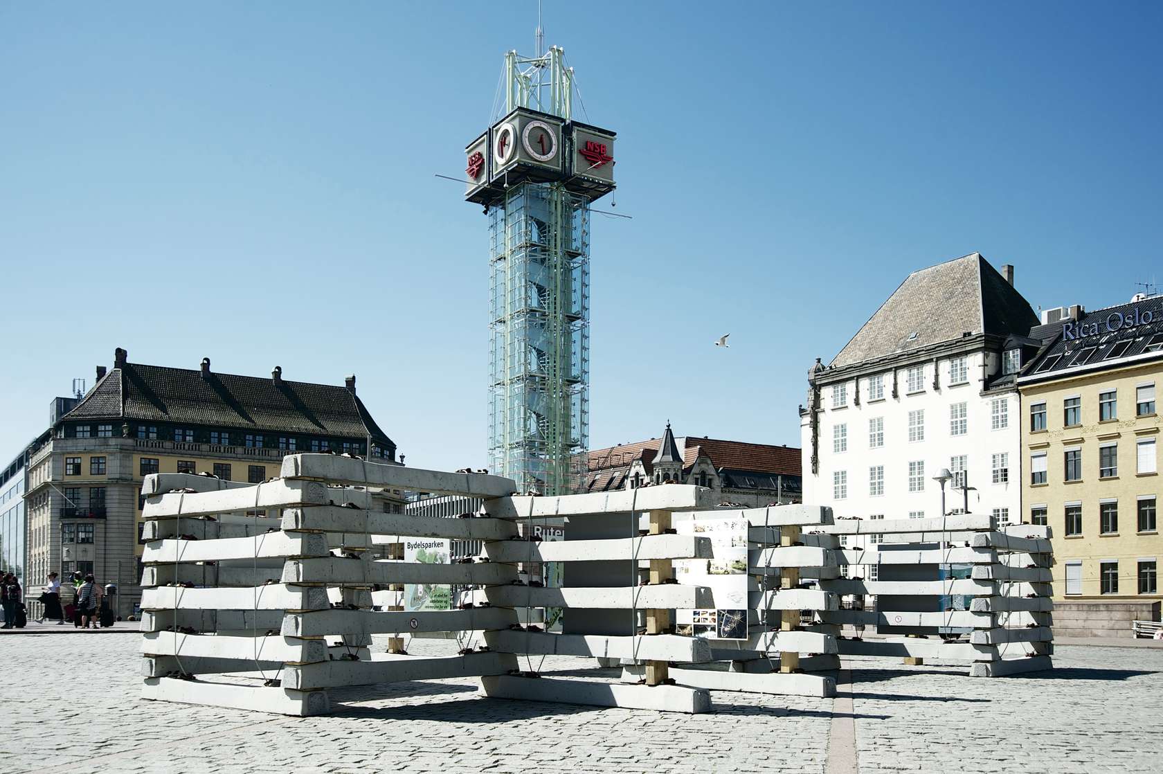 This exhibition design at Oslo Central Station pre-cycles “the use of the materials before the intended use” to display three proposed projects for the future plans of Medieval Park: 85 concrete railroad sleepers form log-cabin-esque walls, on which the exhibition’s printed aluminum boards are attached.