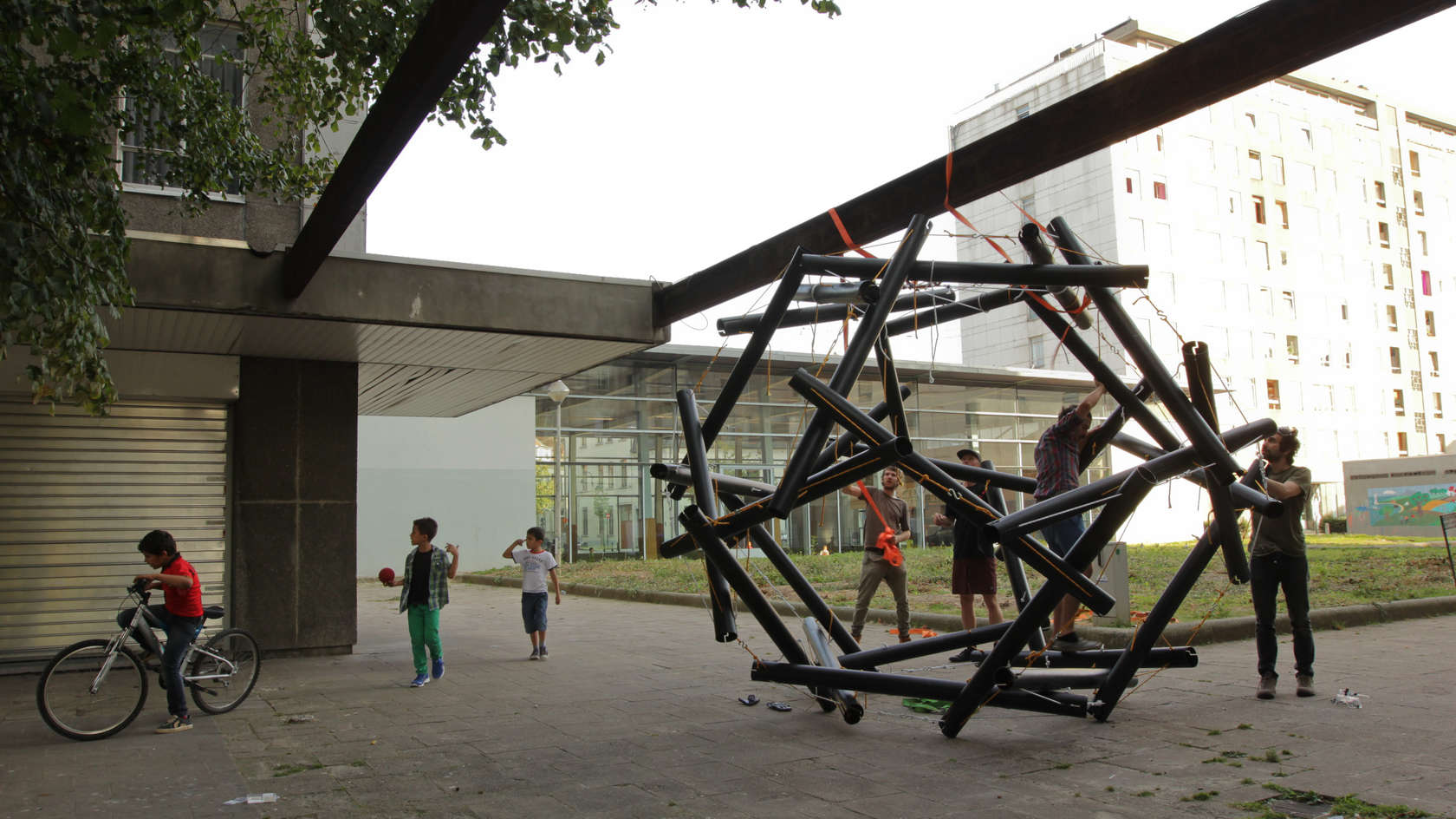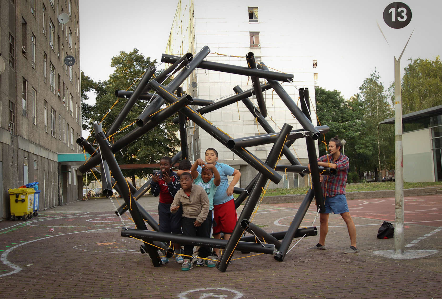 The BOULEvard ball was constructed based on the principles of Buckminster Fuller, specifically tensegrity. In a series of workshops, locals constructed the rolling playgrounds in unexpected places on the street of Brussels for the 2014 Kanal Playground Festival.