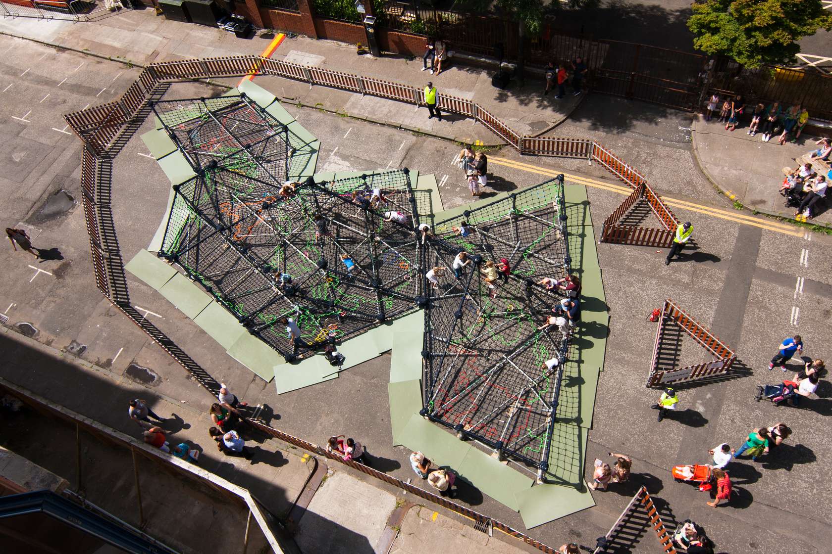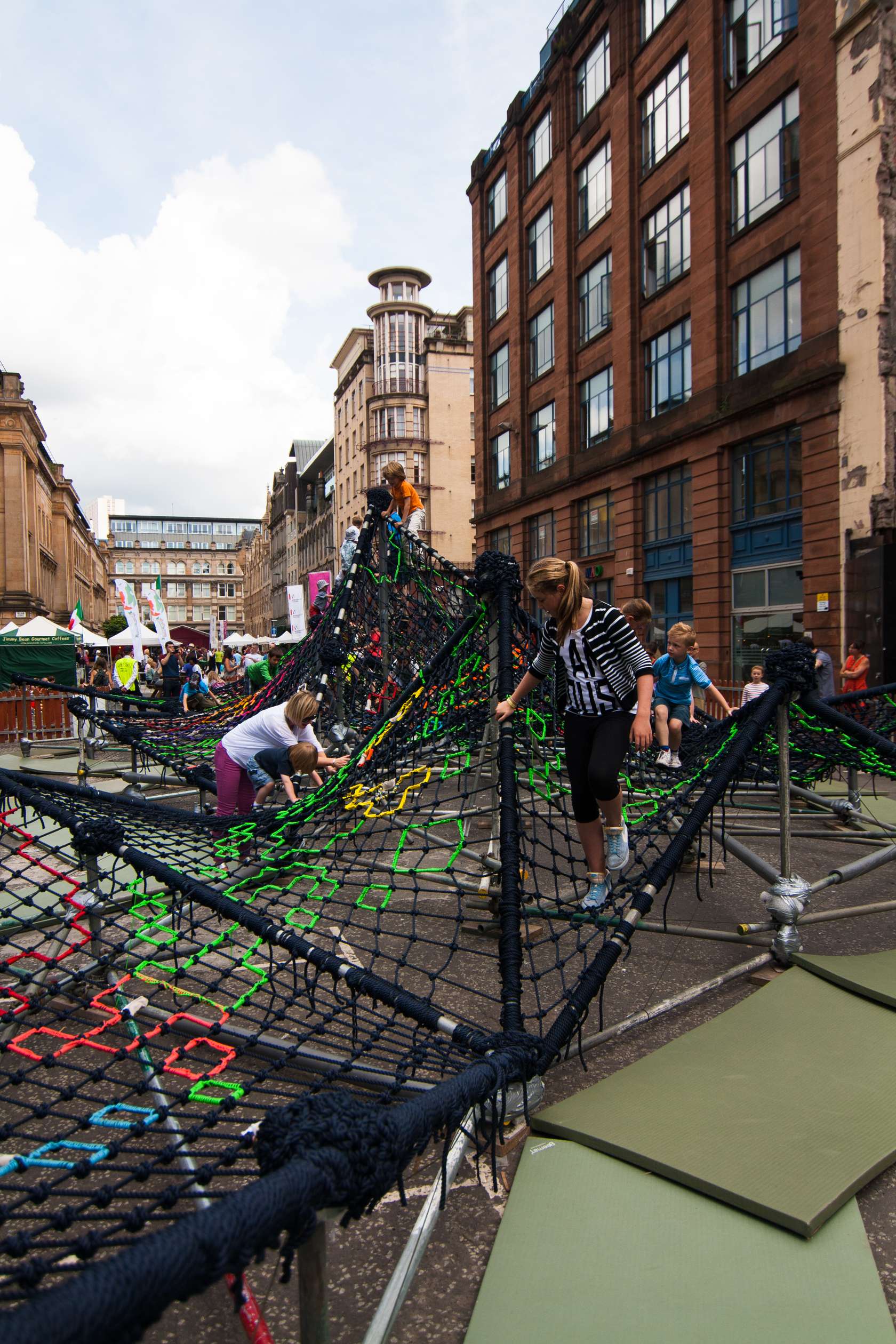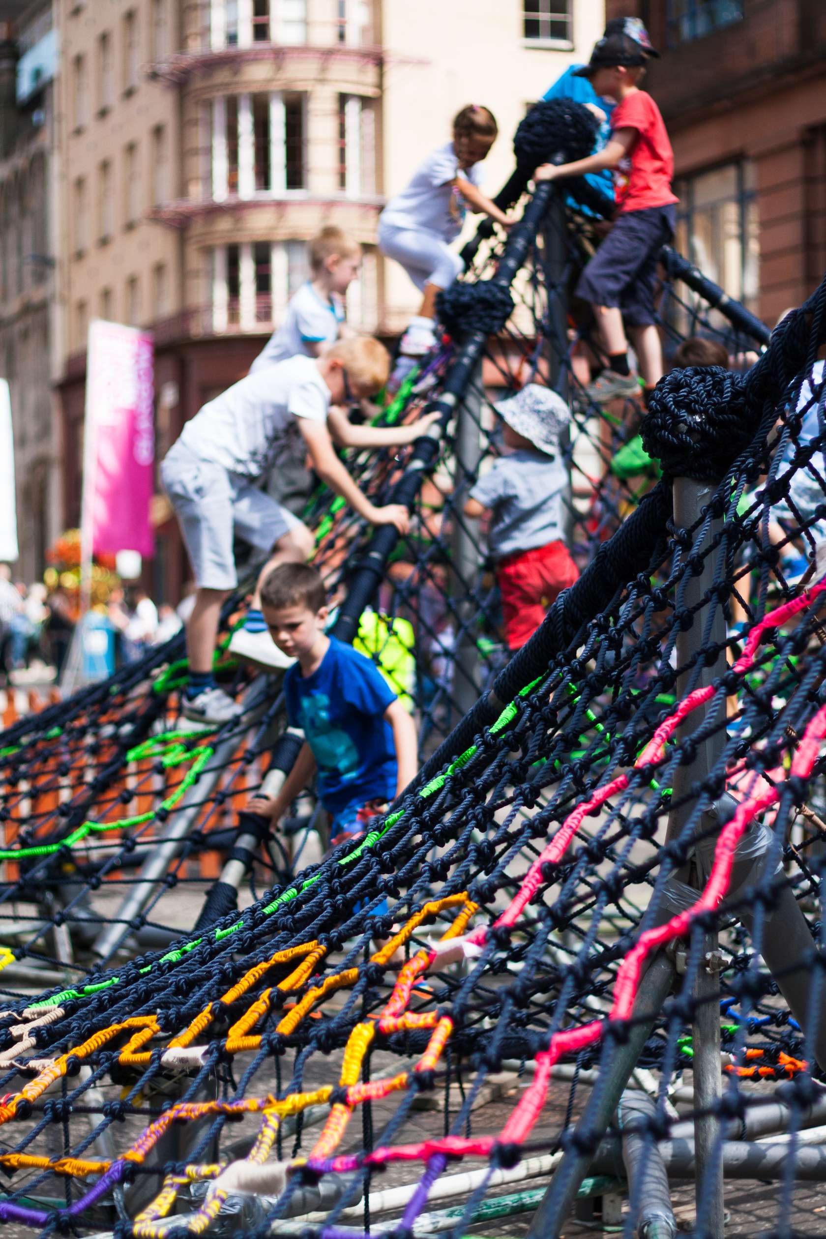 The Rope Factory is a three-day installation that utilizes 71 different rope colors to represent the 71 teams in the multi-sport 2014 Commonwealth Games in Scotland. This interactive piece literally maps all of the countries of Commonwealth strung throughout the street as a large climbing net.