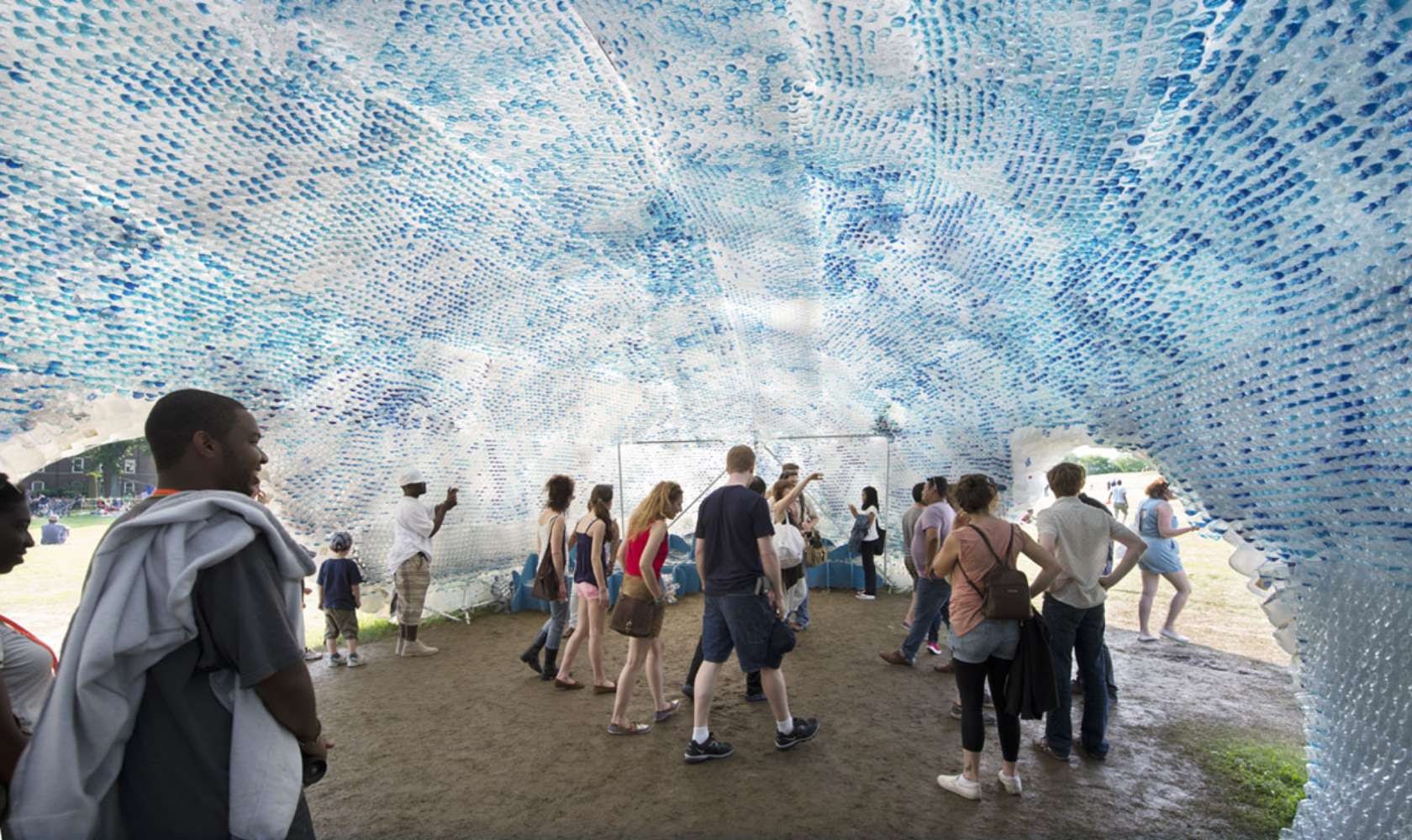 This temporary social hub that was for the Figment art festival on Governer’s Island is made up of 53,780 recycling plastic bottles. That total represents the number of bottles thrown away in New York City every hour.