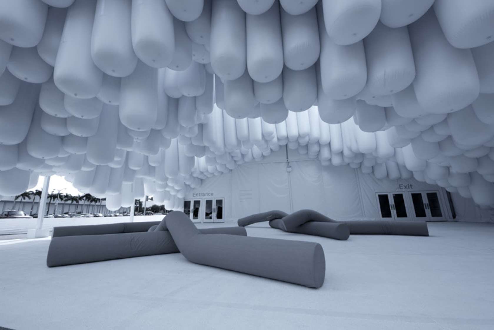 The conventional white party tent became the unexpected white (and grey) party tent at Design Miami 2012. The Brooklyn-based designers turned the ceiling into a topographical landscape of white vinyl tubes, with matching benches to boot.