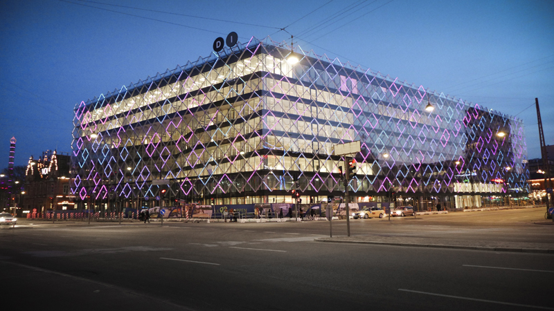 Located in the heart of Copenhagen, across from City Hall and next to the entrance to Tivoli Gardens, this programmable facade lights up with a colorful diagonal display.