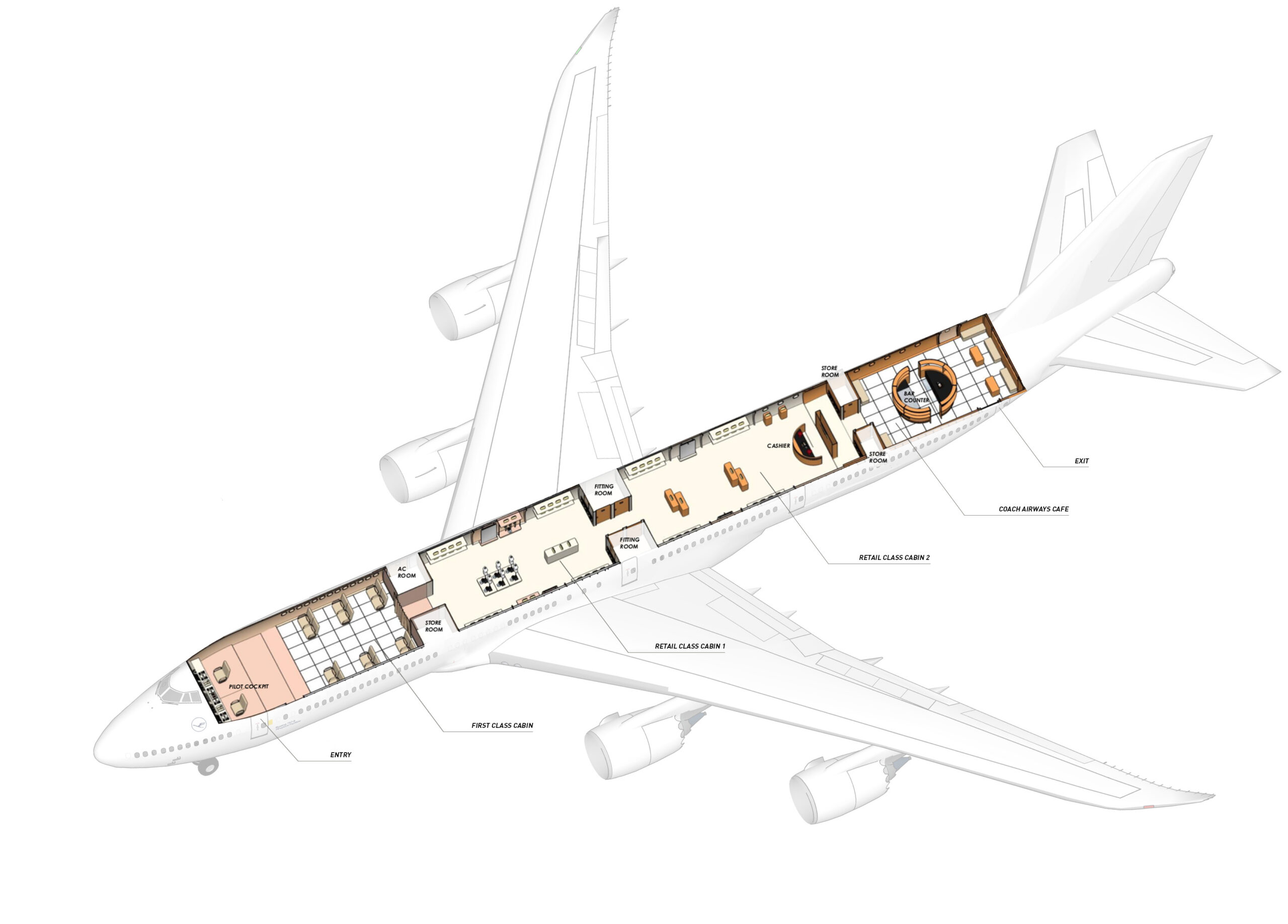 Then comes the café at the rear of the plane, and the mood shifts. The entire space is drenched in orange. Seats, walls, counters, everything. The color brings warmth to the metallic shell of the aircraft and turns the cabin into a glowing, almost cinematic setting that feels lifted straight from a retro-futurist dream.