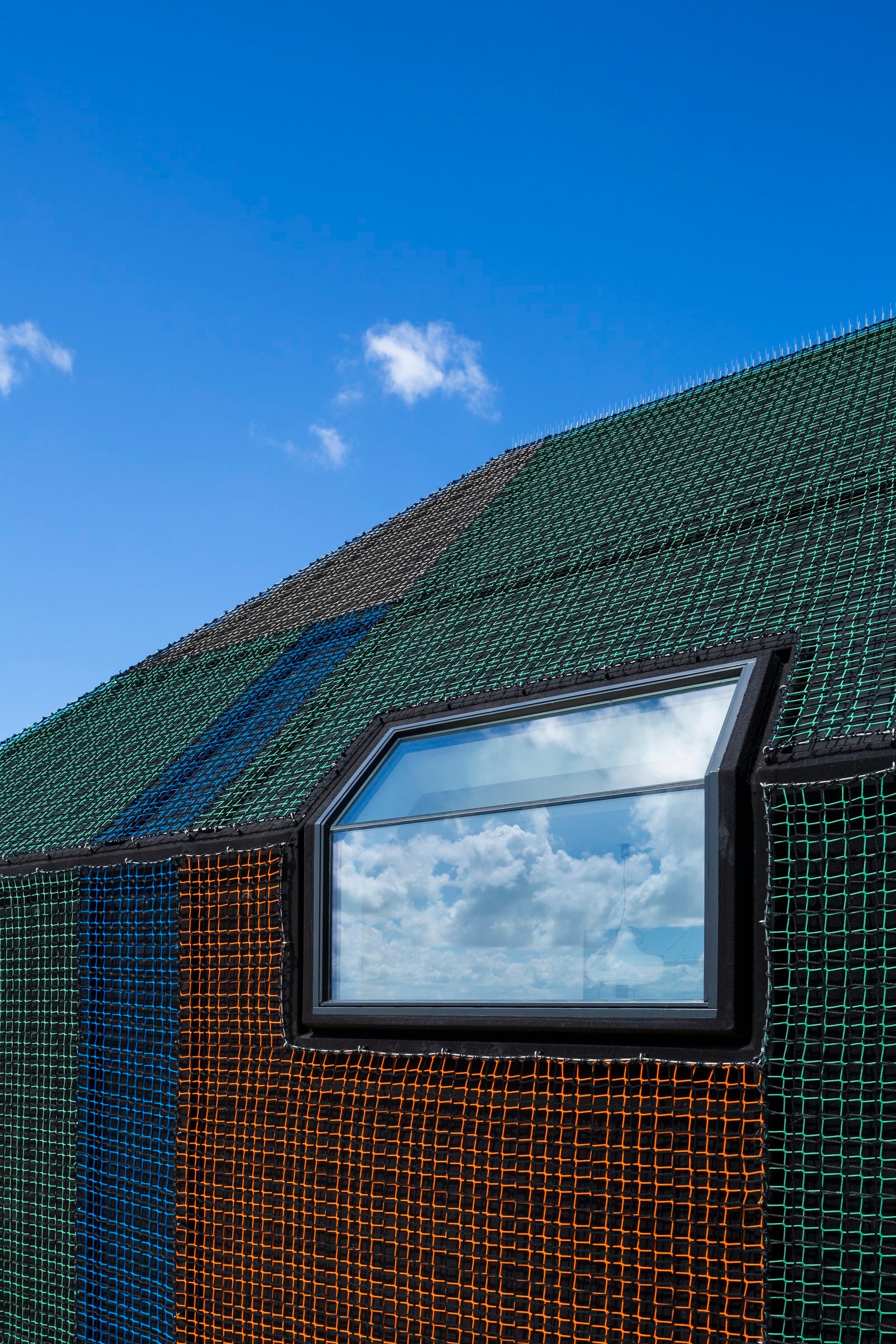 This vacation home, located on the island of Texel, just off the coast of the Netherlands, uses unconventional materials to pay homage to the island’s past. The shape of the home is modeled after the ‘schapenboeten,’ or farm sheds, which originally dotted the rural landscape. The walls and roof were constructed with prefabricated, composite wood panels and sprayed with Liquid Rubber HB S-200 to create a waterproof finish. Layers of colorful nets, a nod to the fisherman who first inhabited the island, were then laid over the black rubber, giving the façade a playful appearance.