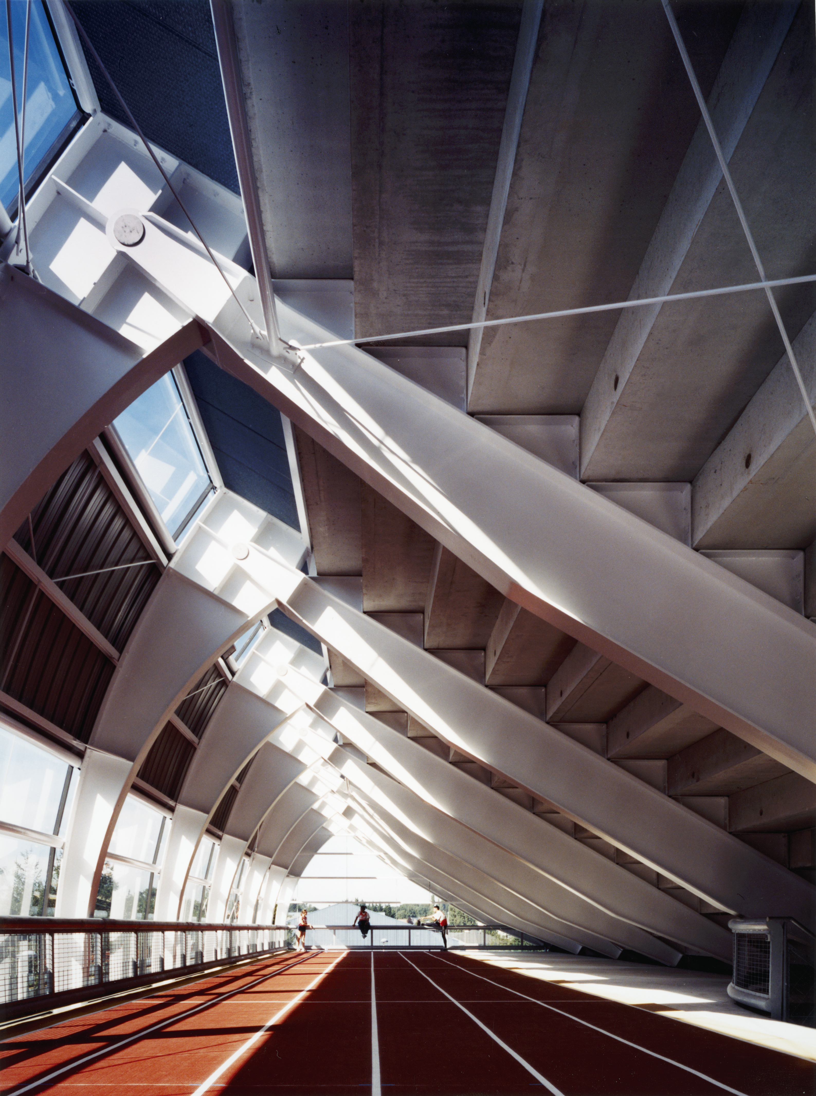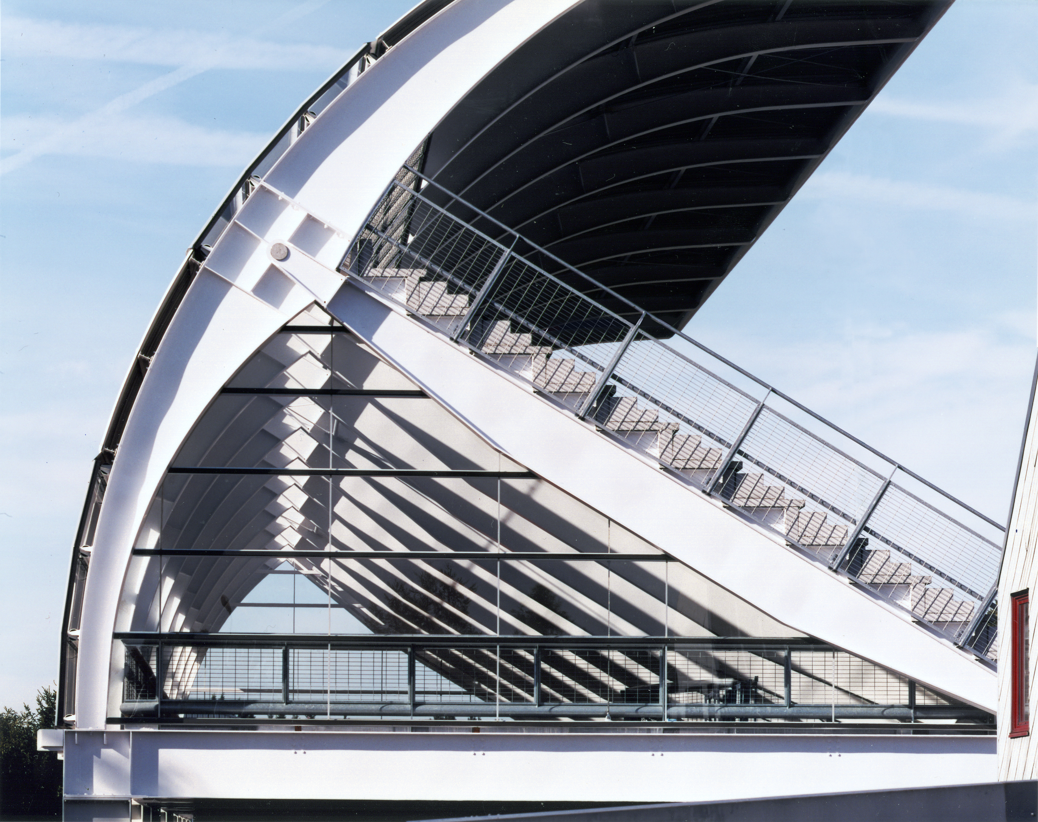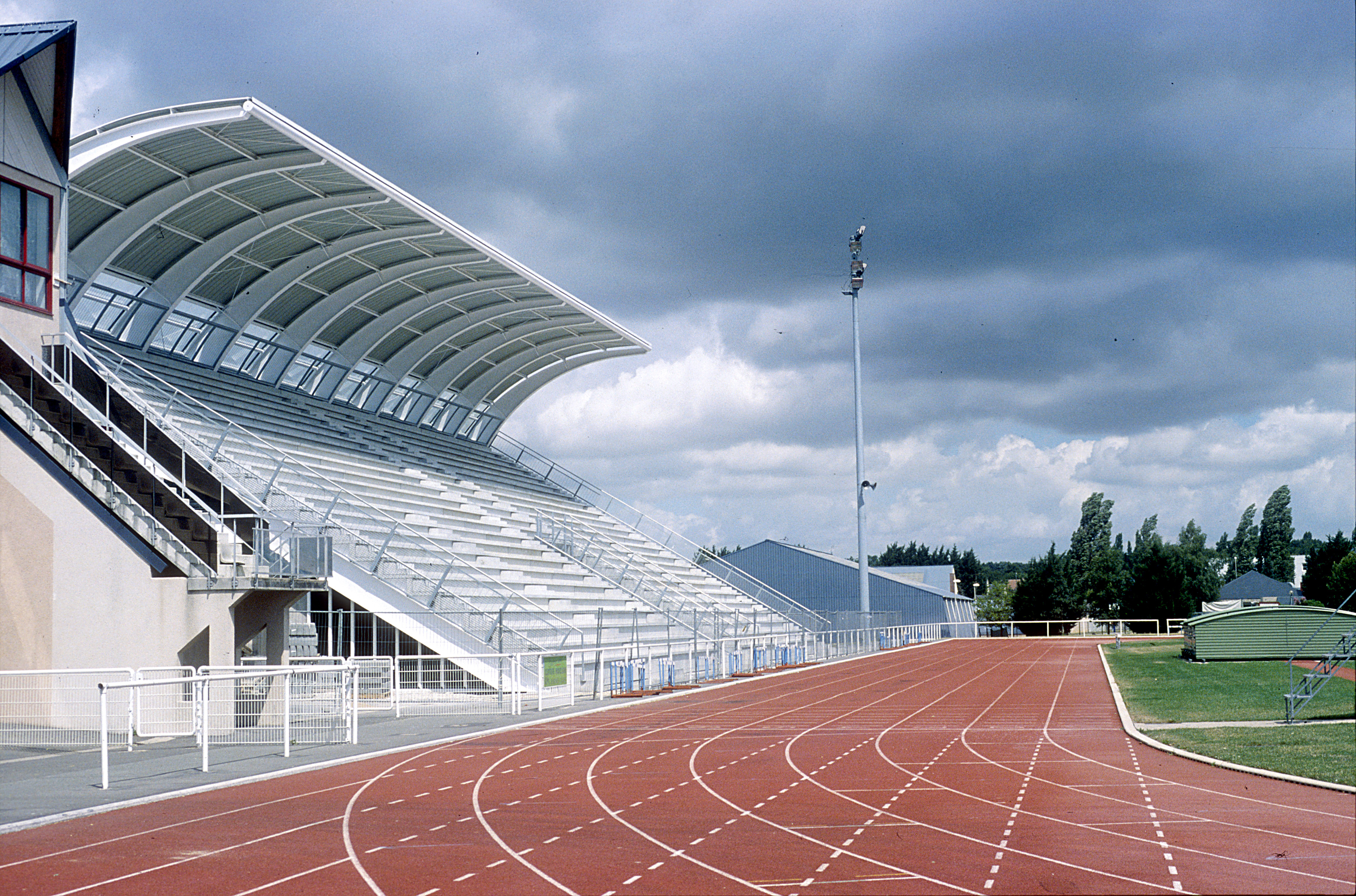To describe the Léo Lagrange sport complex in Toulon as a stadium in the singular is incorrect. The four massive arches of the roof actually cover two grandstands that face in opposite directions: one toward the running track, the other toward the training ground.