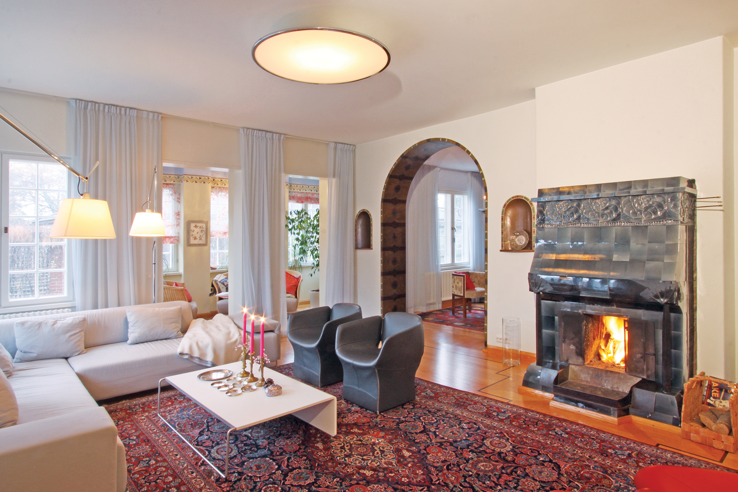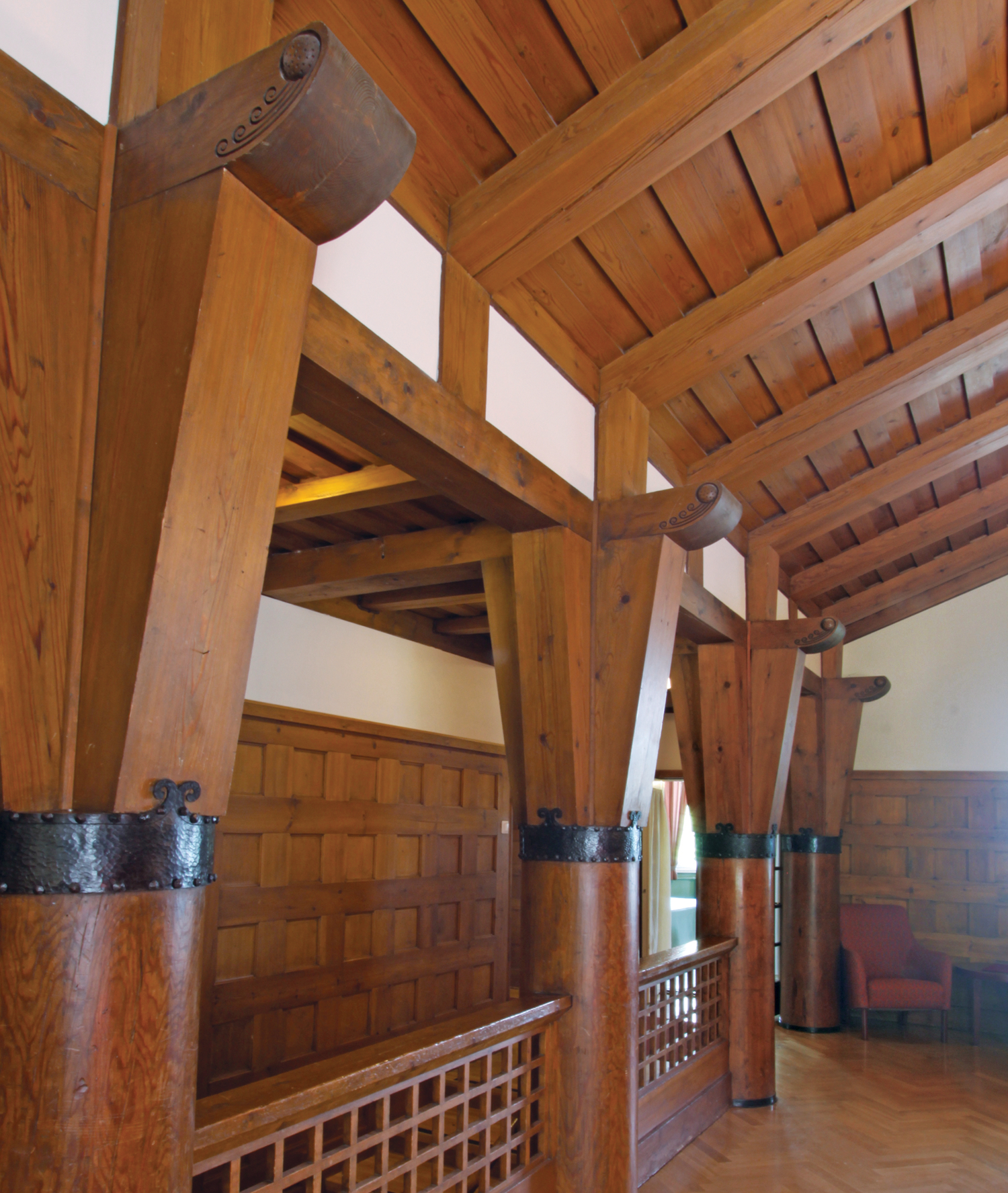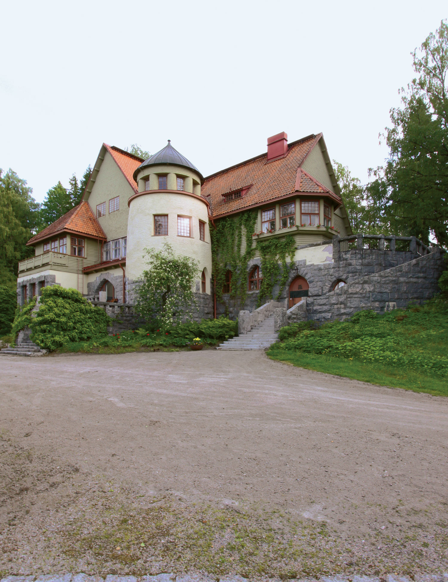 Set on the bank of Lake Vitträsk, Eliel uses the change in elevation to shape the construction of this two-facade house. The authors describe the lakeside face as a “castle of natural stone.” Towards the surrounding forest, it is a wooden structure with a peaked roof. Its complex exterior is a series of terraces and bays, and a formal garden defines Hvittorp as a villa.