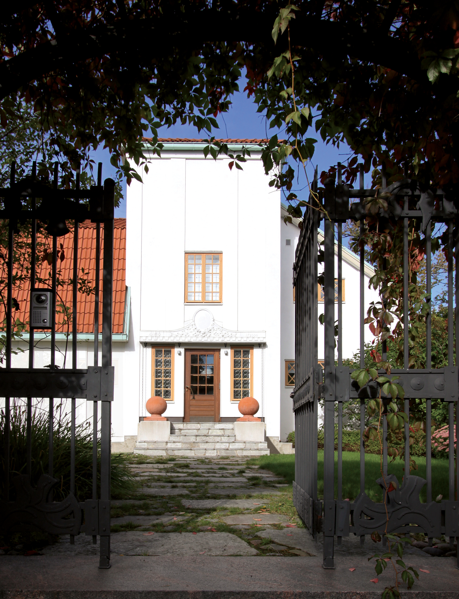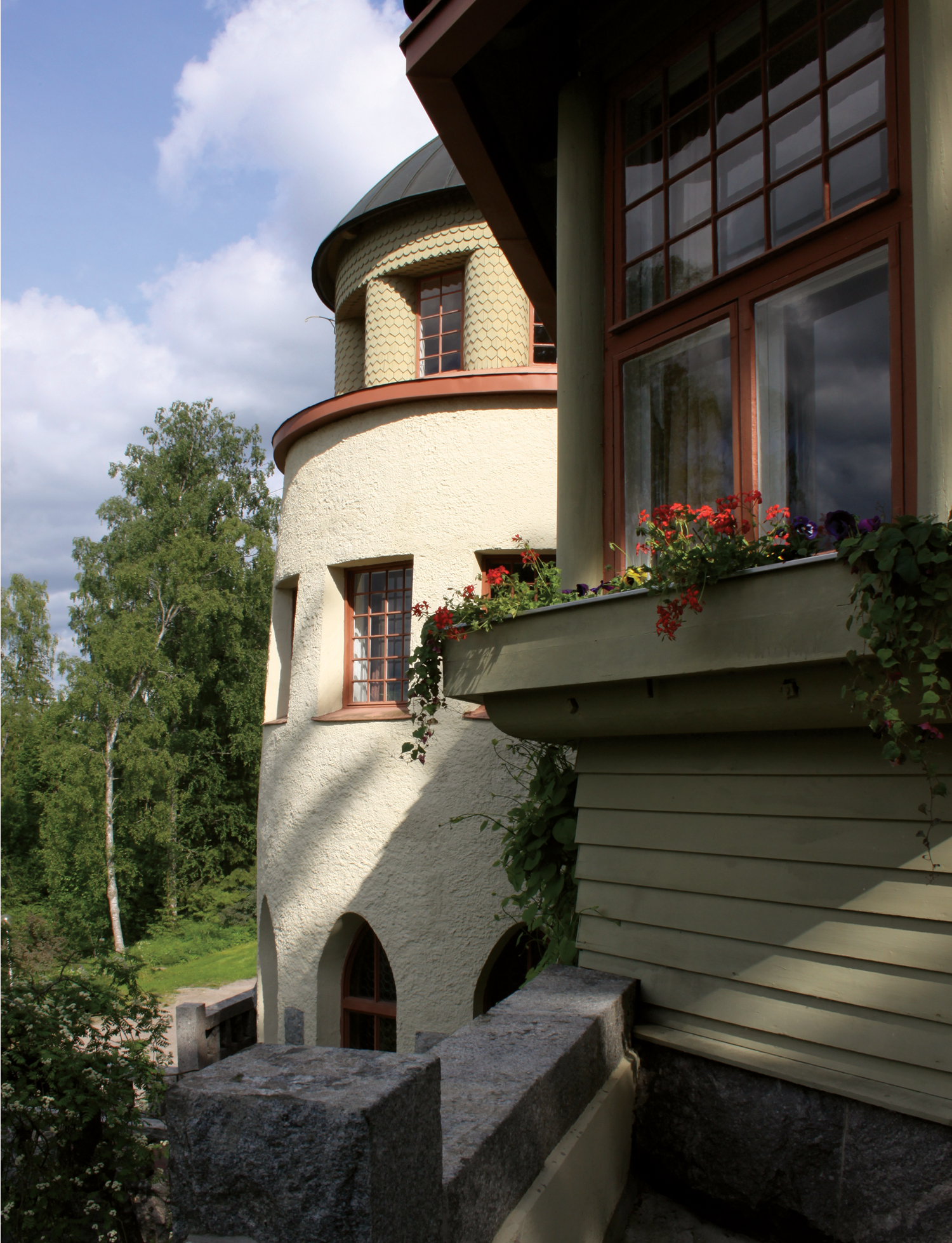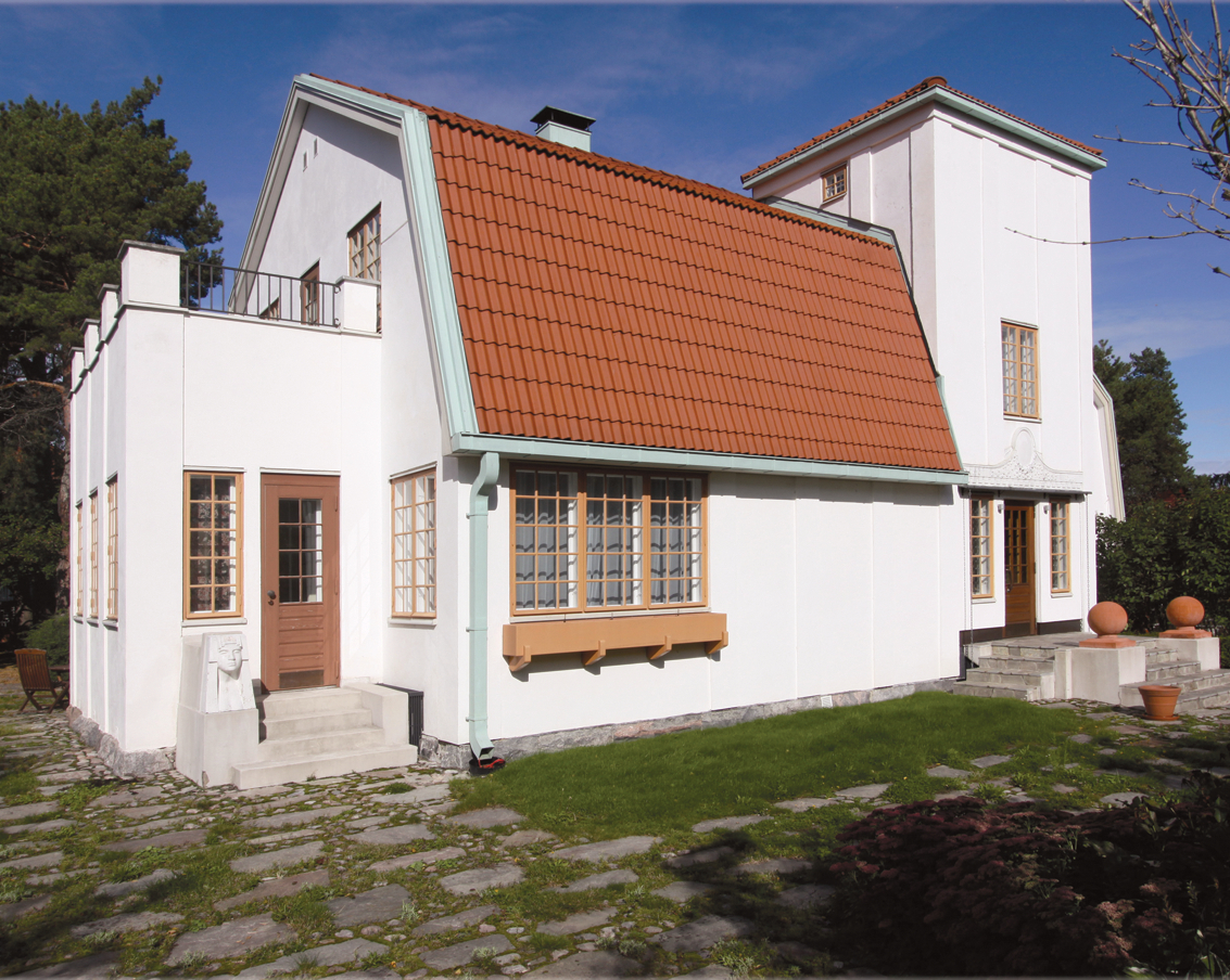This large villa is sited on Kulosaari Island, a community away from the city of Helsinki that promised a natural setting and spacious living. Designed for a painter, the building has whitewashed walls and views of nature meant to provide inspiration. The two-story structure is entered through a square tower, guarded by a sphinx made by the homeowner.