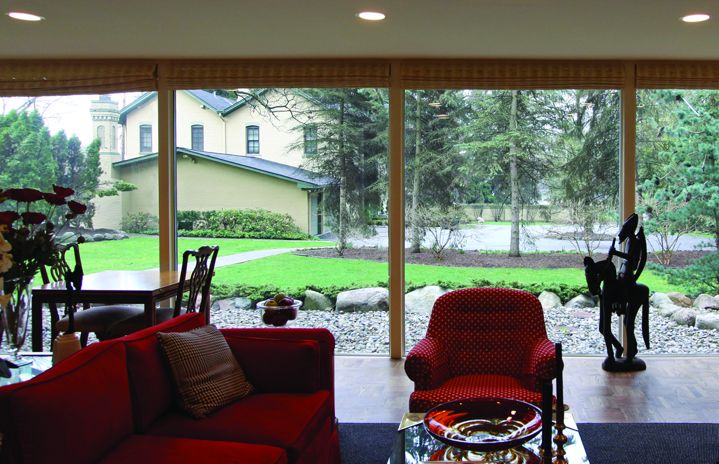 Rejecting the historical precedent of its suburban neighborhood, this modern family home was constructed as a variation of Saarinen House. Pipsan Saarinen Swanson, daughter of Eliel and married to architect J. Robert F. Swanson, designed the interior; the open central space is modular, comfortable for a variety of activities, and defined by the placement of furniture, selected by Pipsan. Curving interior walls provide gentle definition of some rooms, and the brick exterior is brought inside with a sweeping one-story wing where a winter garden is located.