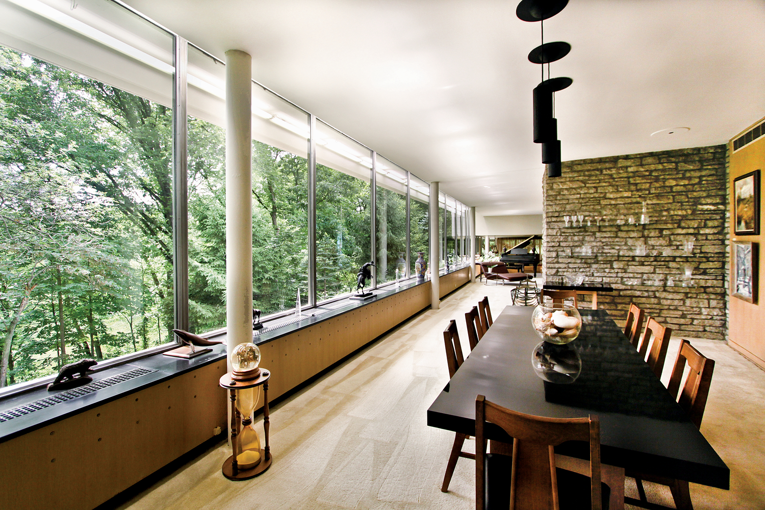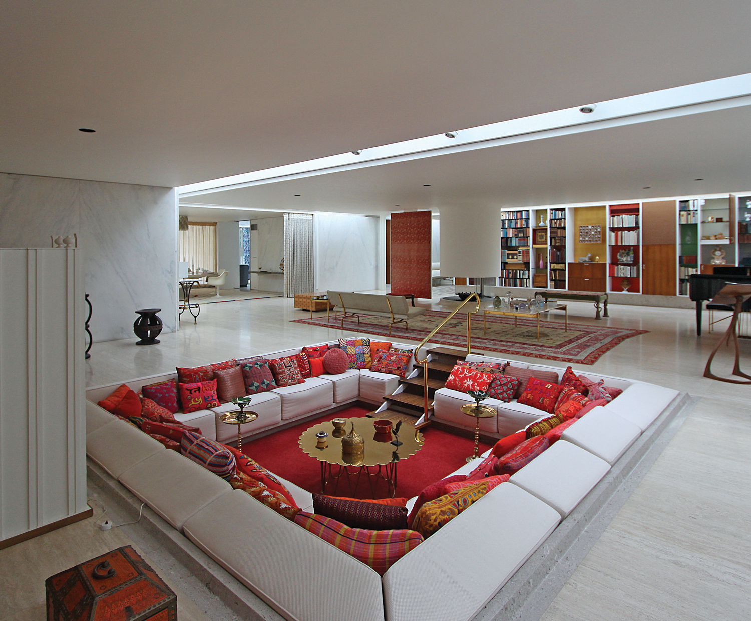 Working closely with his firm’s lead architect, Kevin Roche, Eero conceived of this private residence for J. Irwin Miller, an industrialist, and his family. Alexander Girard also contributed to the project and oversaw the interior design, from furniture to fabrics. The result of this collaboration is a rectangular structure with a central, open-plan living and dining room surrounded by four enclosed private spaces arrayed in a pinwheel. Gardens ring the residence and are showcased within the interior thanks to floor-to-ceiling glass windows.
