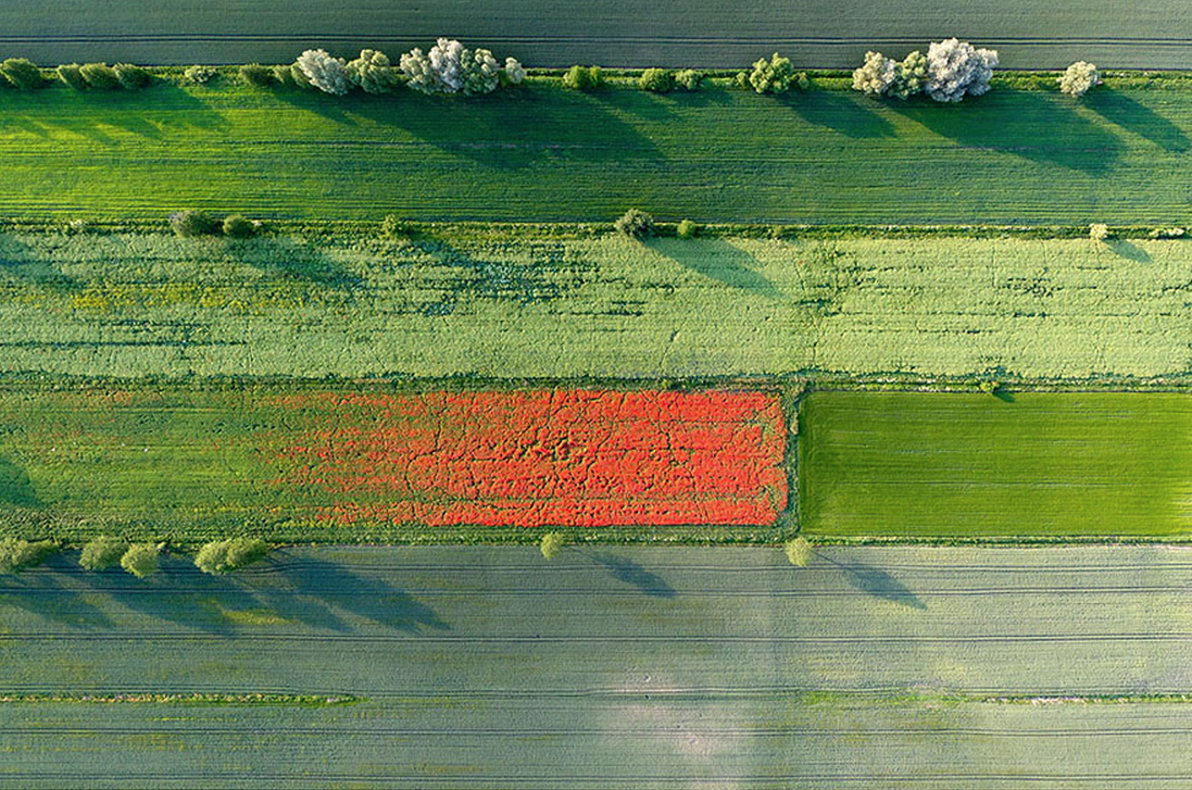Other seasons in Poland provide moments of aerial magic too: As shadows lengthen in the late afternoon, these spring fields near Nowe erupt in a riot of color. Kowalski paraglided over the historic region of Pomerania to capture this abstract expressionist shot, with poppy weeds appearing as a brushstroke upon a canvas of green grain sprouts.