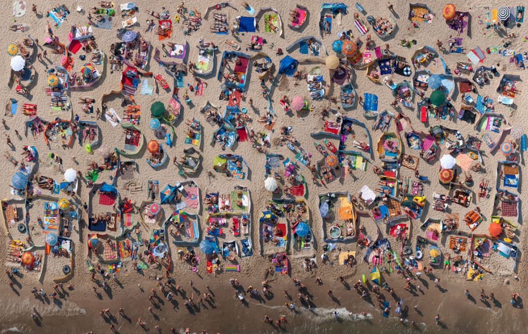 Living on the coast, Kowalski spent time studying the changing landscape created by sun worshippers on the beach during the course of a long summer’s day. Starting out with an empty stretch of sand at 6 a.m., the photographer describes the transforming scene: “I like watching how little sunny valleys are created every day – with its alleys, plazas, and neighbours’ fights.”