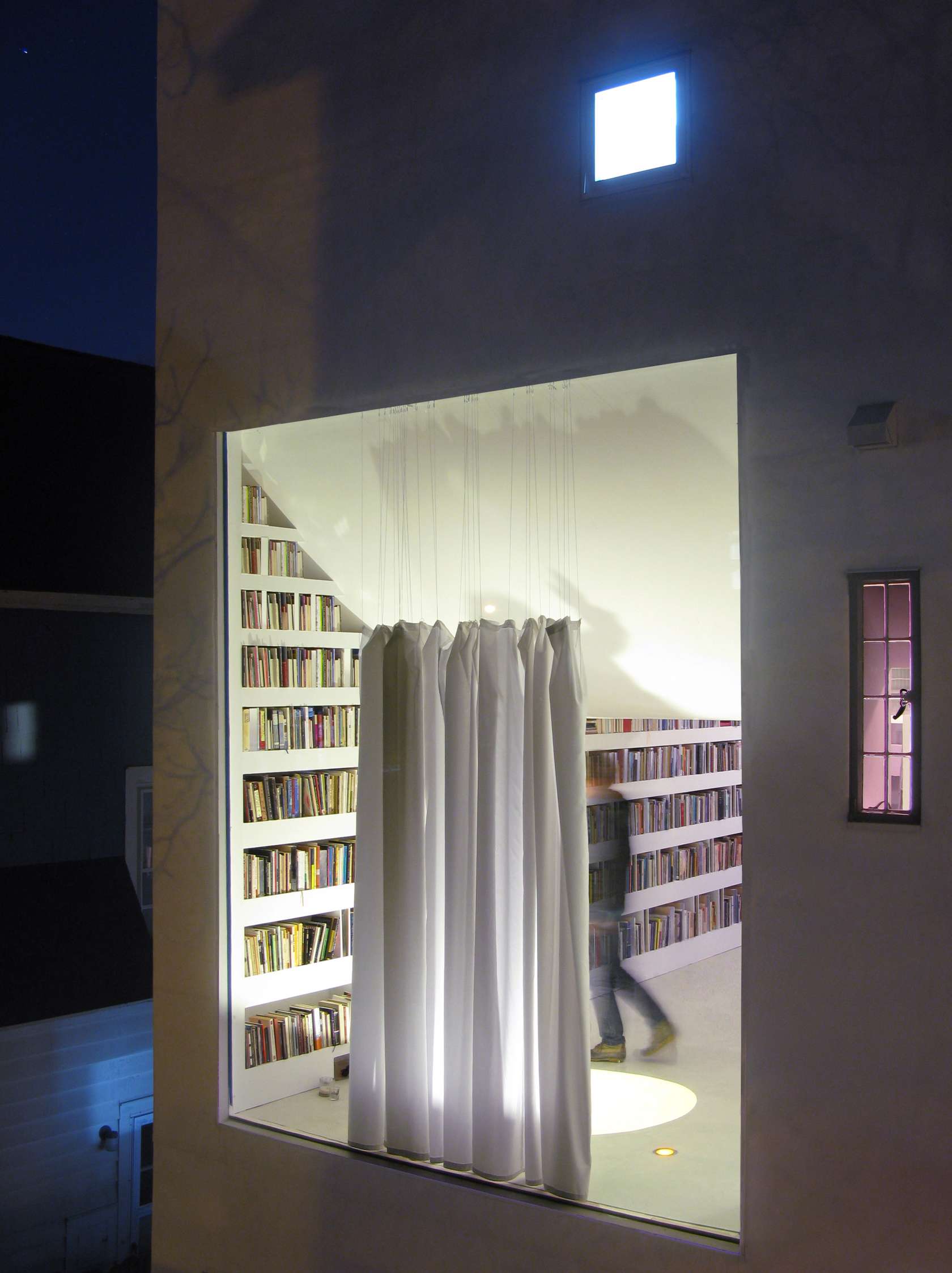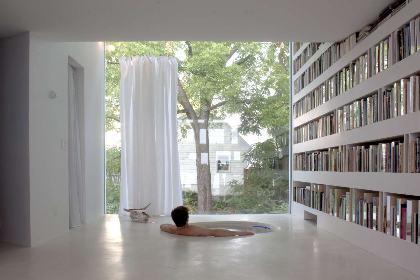 Inspired by Gianni Pettena’s 1972 Ice House, the A+Award-winning Haffenden House is a writing studio designed for two poets. In a residential neighborhood in Syracuse, the white cuboid is flanked by two existing suburban homes. The ground level holds a garage and breezeway, ascending to the brilliantly integrated library, writing, and bathing space. Silicon fabric skin allows for the internal space to fill with natural light, while the rear is covered with hung fabric to offer privacy for nighttime bathers.