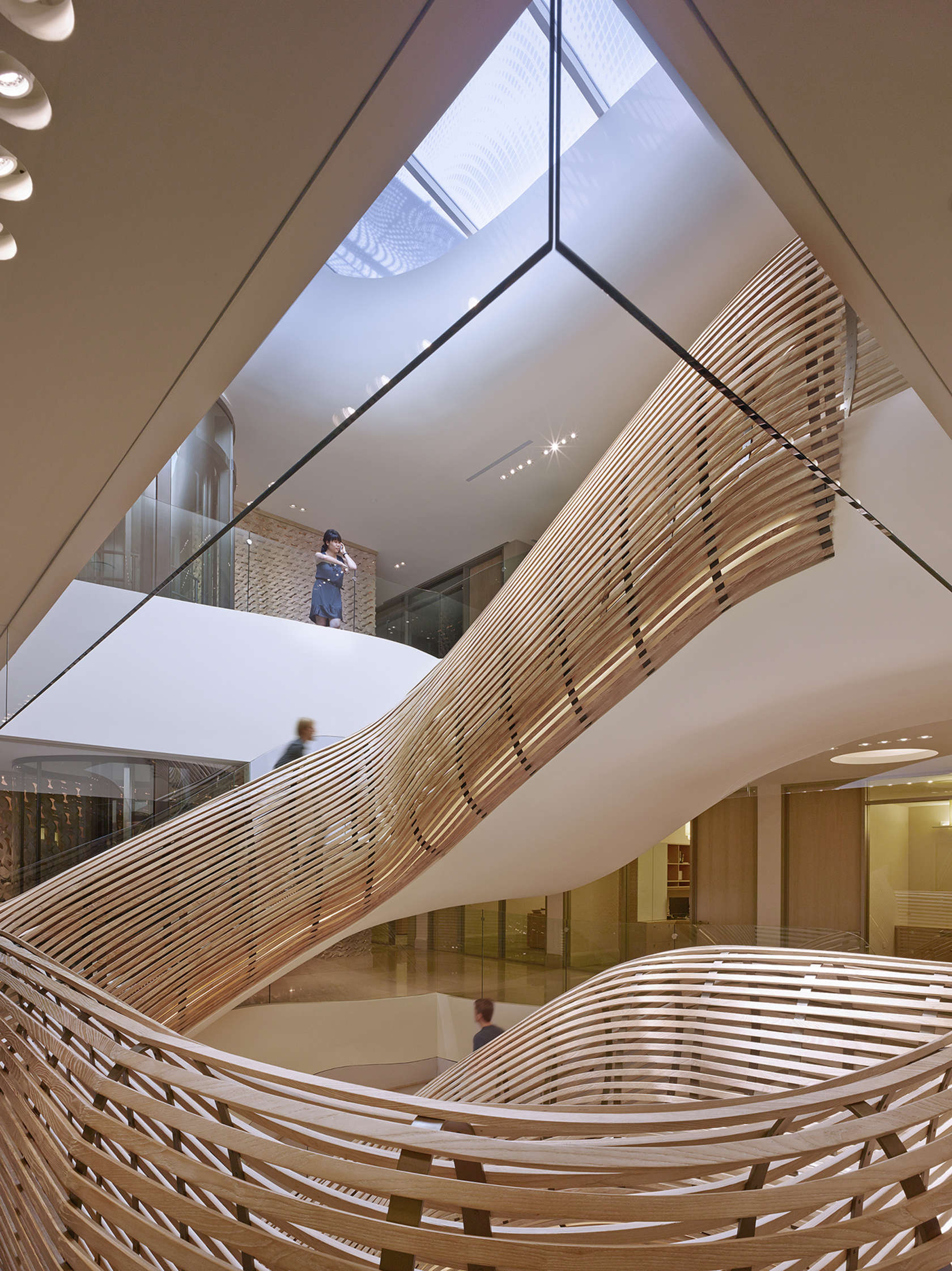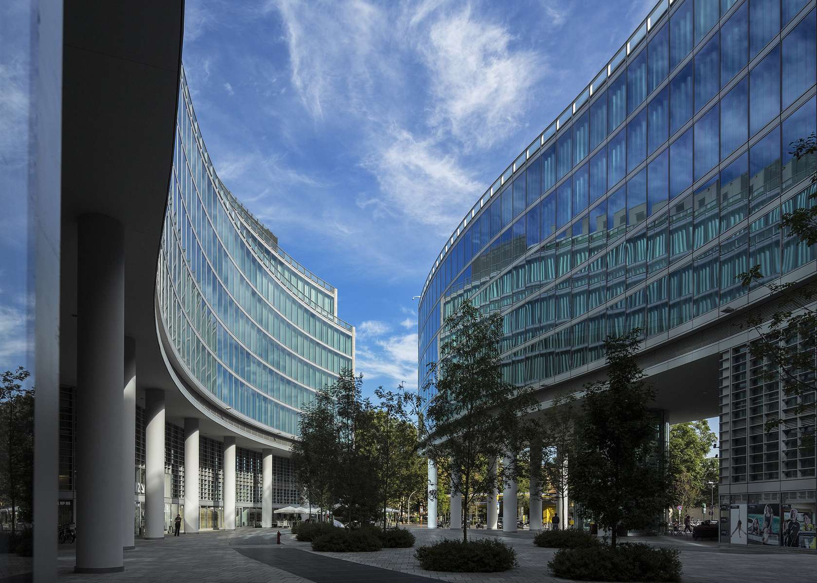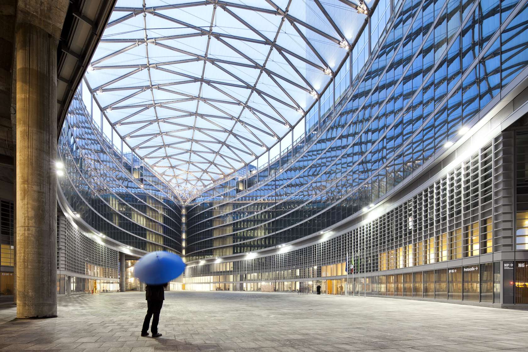 The sweeping glazed walls of this government building in Milan, Italy, follow sinuous lines that form a number of unique landscaped public spaces at ground level. The high-spec blue glass is complemented by a lightweight ETFE roof structure over the central plaza.