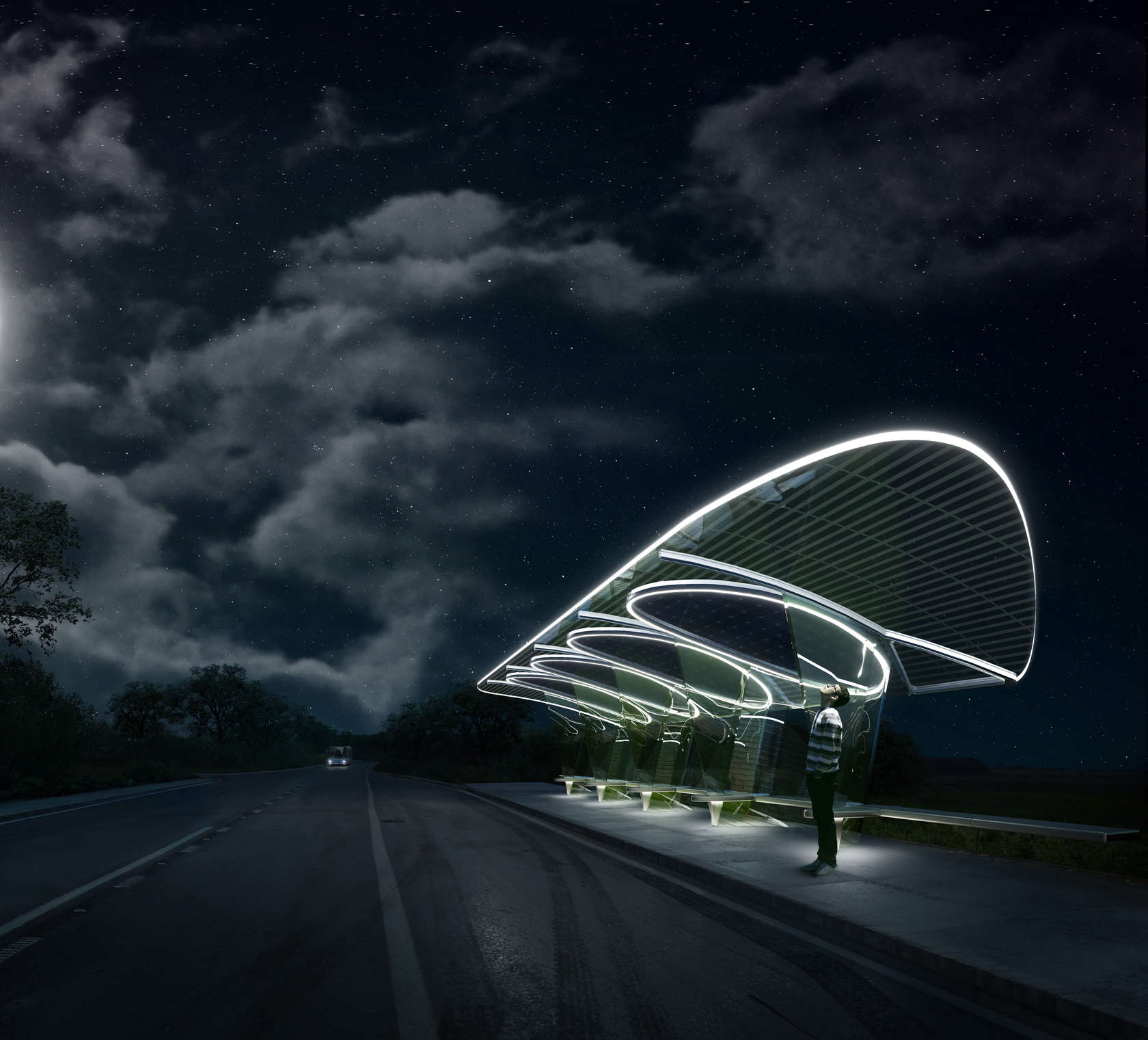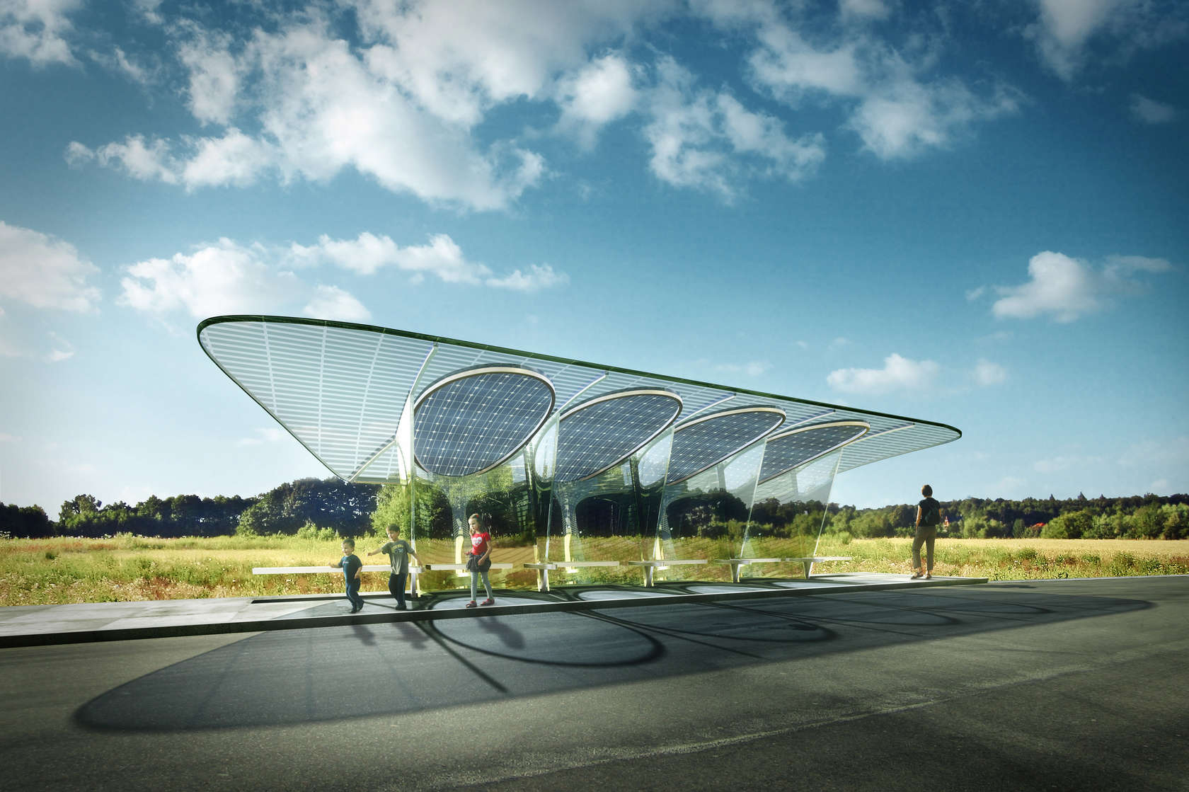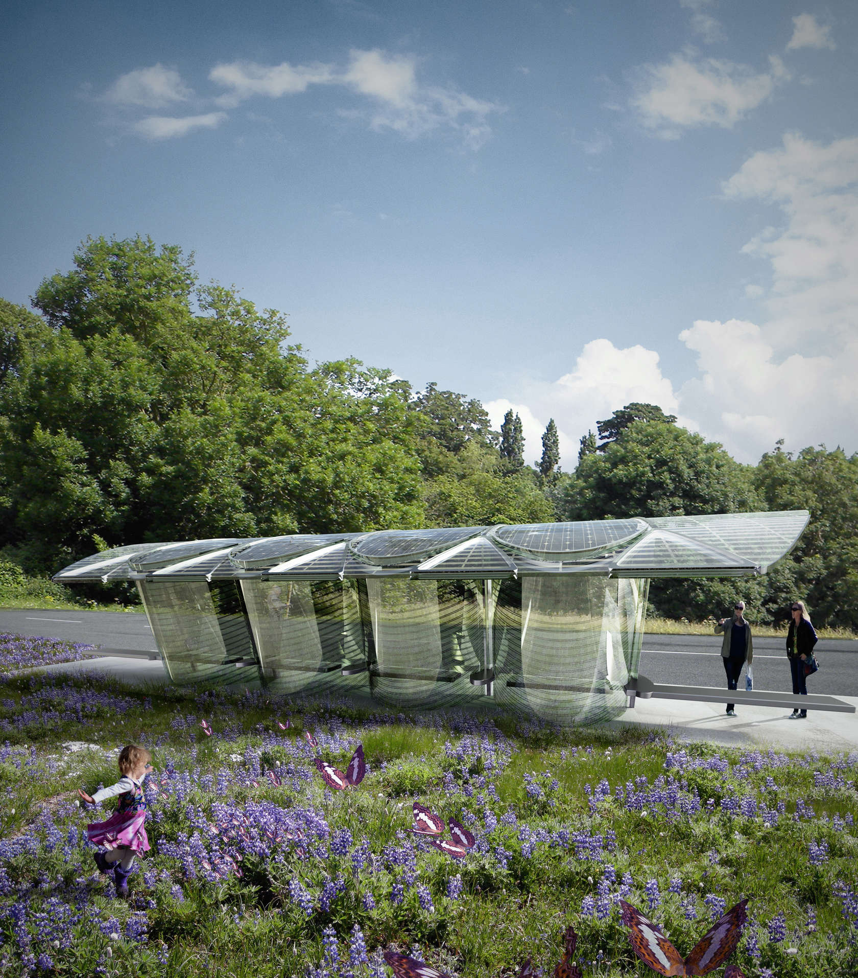 Innovation in glass can occur on a small scale too, as seen in Form4’s Glass Butterfly bus stop: The structure’s curving canopy features integrated photovoltaic panels that provide power and shade for the space below.