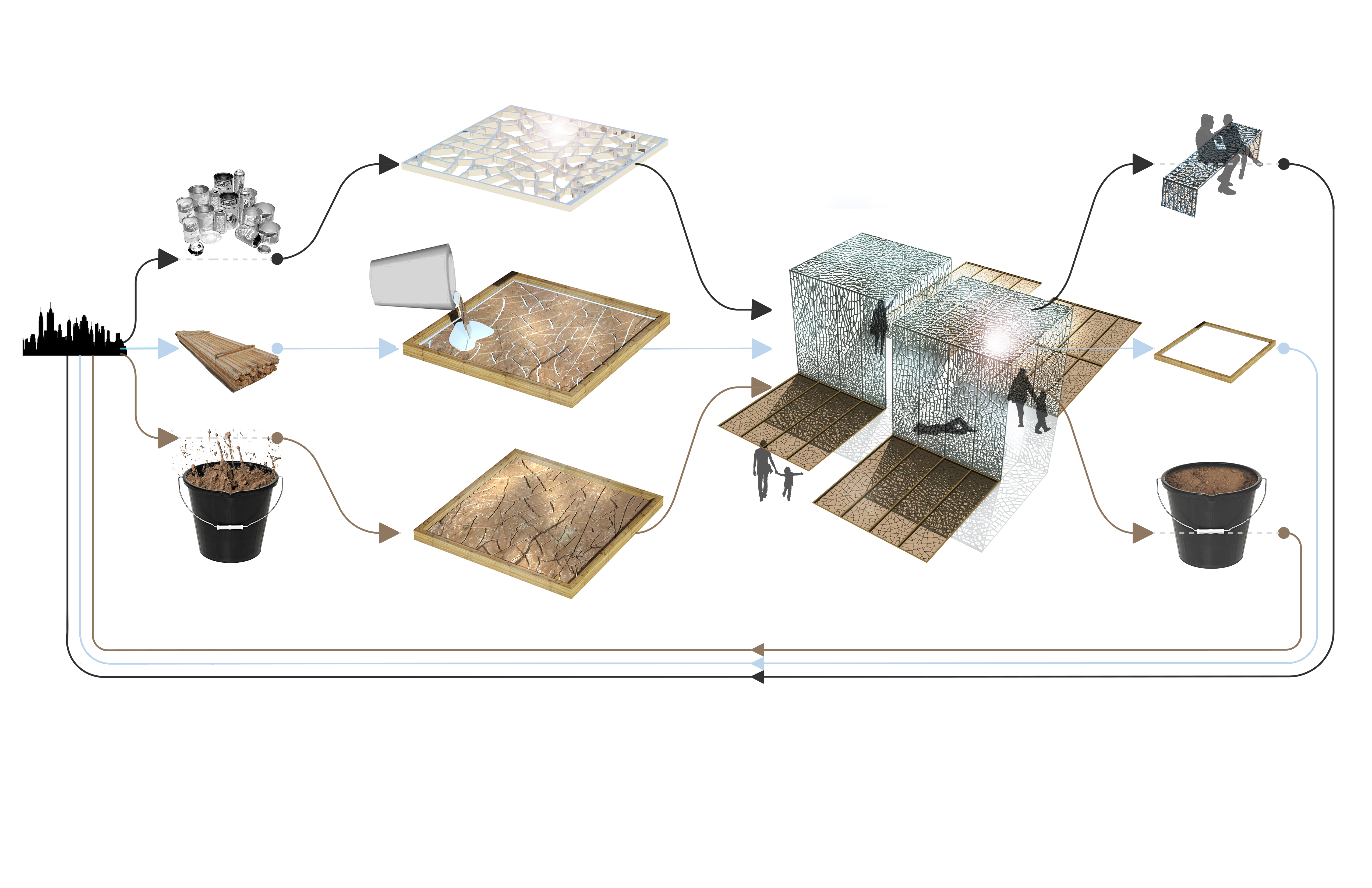 Wooden frames and shallow trays of cracked clay will serve as the formwork for panels that make up the shade structure. Molten aluminum will be poured in between the crevices of the clay, cohesively blending together to form a series of permeable metal surfaces. Cracked-clay reflecting pools will also be built into the ground on each side of the panels, showing in real time how the material responds to hot and rainy weather conditions. After the summer, the panels will be turned into benches and trellises for supporters on the project.