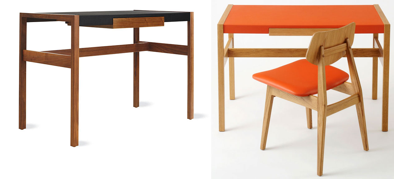 Risom originally designed this compact writing desk for his own home in New Canaan, Connecticut as a small-space solution. The piece is constructed of solid walnut or oak with chocolate or black leather accents and a removable solid wood accessory tray inside the drawer.