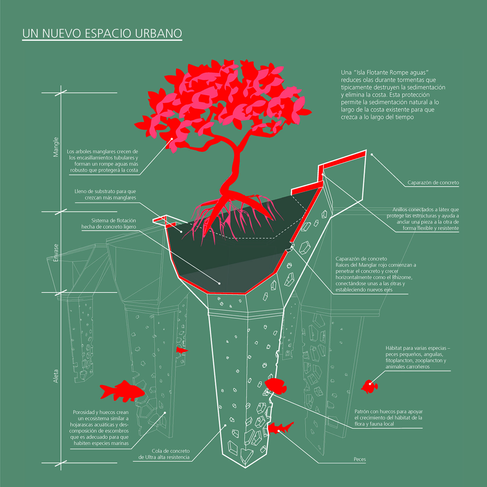 A partnership spearheaded by APTUM with CEMEX Research Group and Syracuse University architecture students resulted in an experimental project of floating concrete islands to reintroduce mangroves along the Port of Cartagena, Colombia. The floating structure is a root system encased in mineral matter, created through processes of weathering, decomposition and cementation. Serving as breakwaters, the structure is composed of two parts: a “head” and a “fin.”