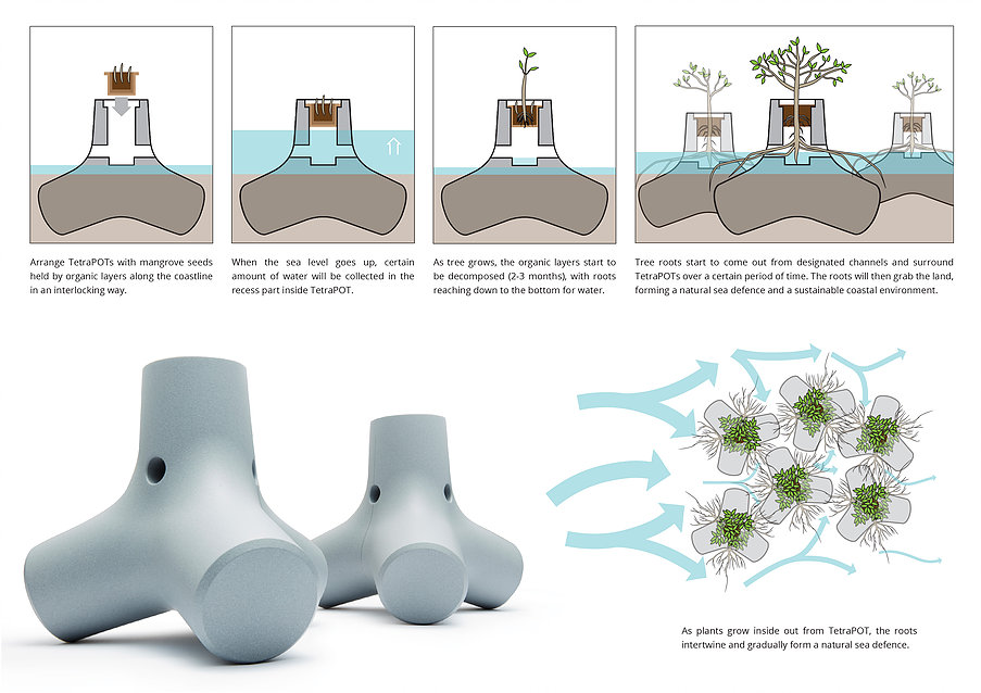 Lee+Lee created a synthesized form that exploits the strengths of natural and man-made coastline defense systems after noting the failure of Tetrapods. The form takes after the Tetrapods, the four-legged concrete structures that occupy many coastlines. The “TetraPOT,” composed of concrete, organic materials and plants, strategically hollows out the tetrapod to hold a decomposable pot and allow mangrove roots to spread outward.