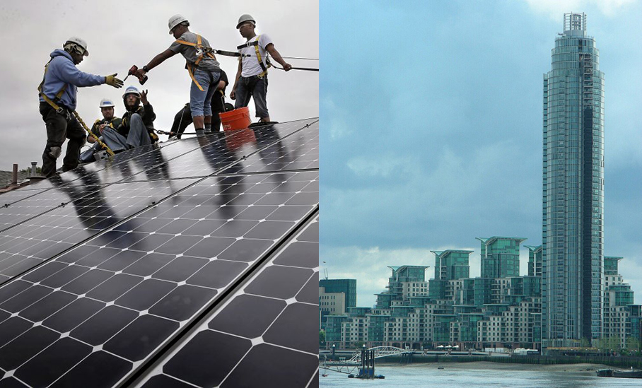 L: Grid Alternatives installing PVs in California, via SFGate; R: St. George Wharf Tower in Vauxhall, London, via Archdaily