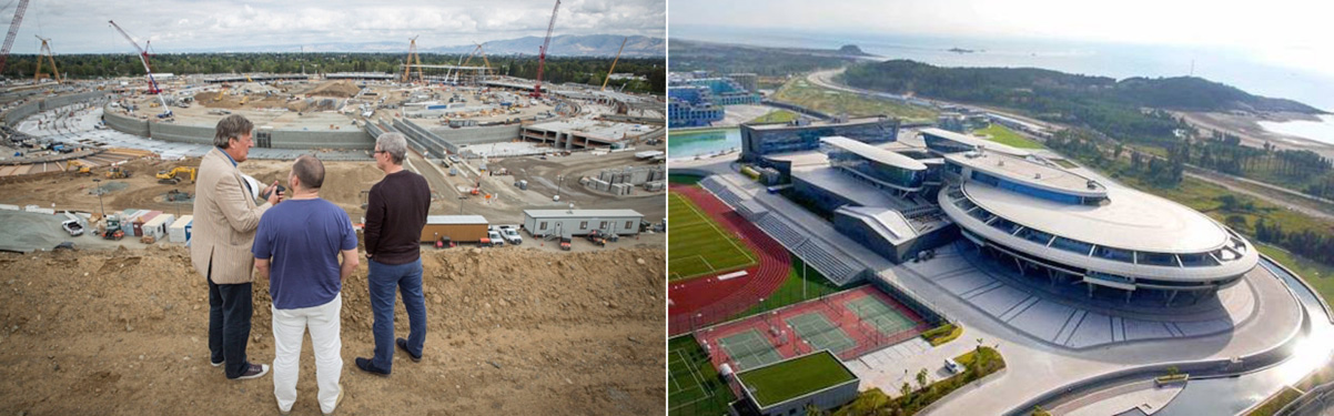 L: Stephen Fry, Jony Ive, and Tim Cook at the site of the new Apple campus. Photo by Gabriela Hasbun for the Telegraph; R: NetDragon Websoft Headquarters in Changle, China, via WSJ