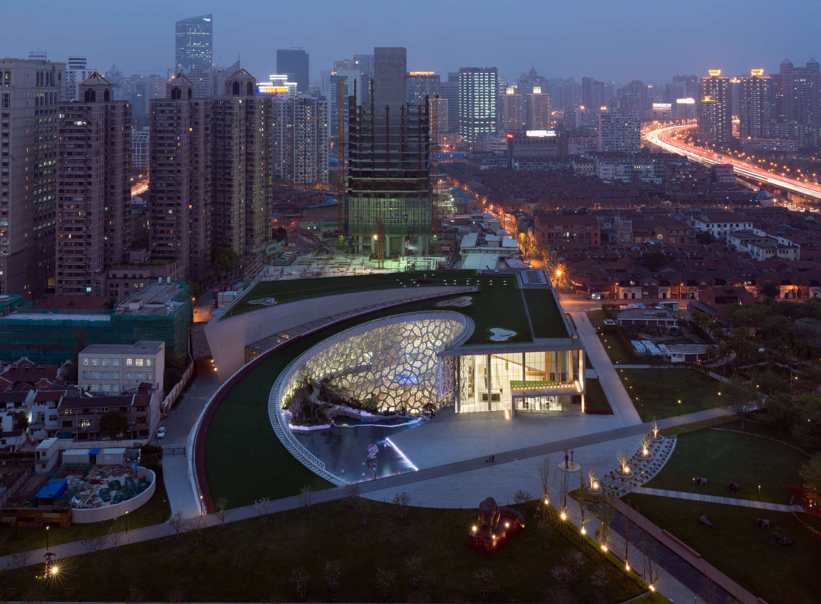 The building’s helical form is inspired by the spiraling structure of the nautilus shell and emerges from the terrain like a fossil in the process of being excavated by archaeologists. A 100-foot-tall atrium leads through to the centerpiece of the museum, an oval reflecting pool that alludes to traditional Chinese gardens.