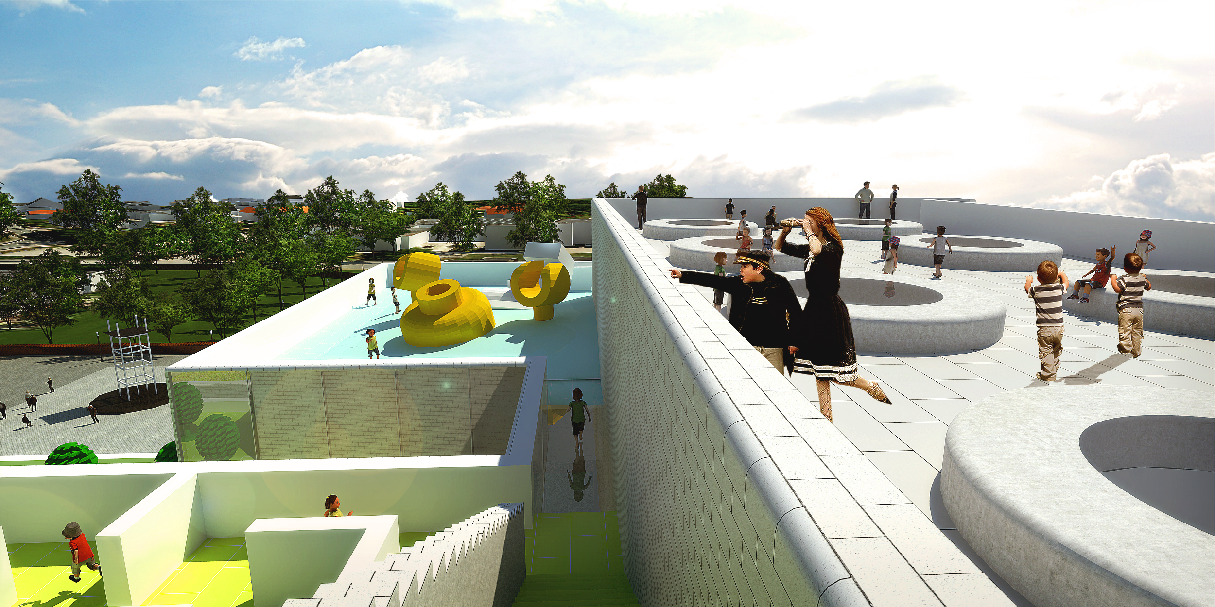Paid experiences on the inside are organized in four color zones that cater programming to different aspects of a child’s learning. Red spaces spark creativity, while blue areas test cognitive skills. Meanwhile, green spaces engage their social brain, with yellow zones designed to enhance their emotional learning.