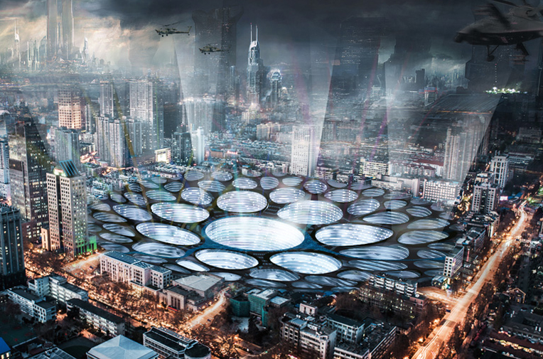 While BIG’s concept raises the program into the sky, others imagine a future in which we must look down in search of environmental protection and sustainability. This entry for the eVolo skyscraper contest was designed within a world bombarded by asteroids and proposes architectural inventions that infill the resulting craters and harness geothermal energy to support human life. While the roofscape looks like something Japanese studio SANAA may have dreamt up, the luminous cityscape looks like the backdrop for an epic space opera.