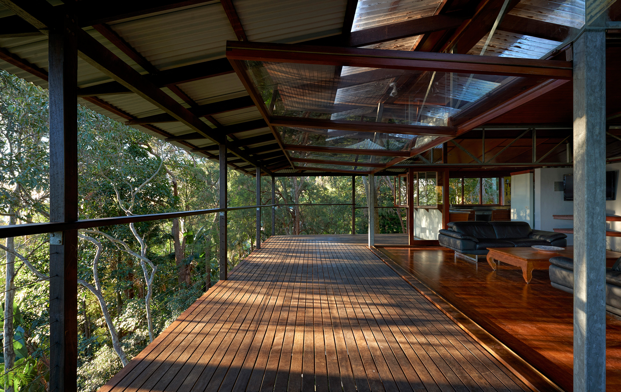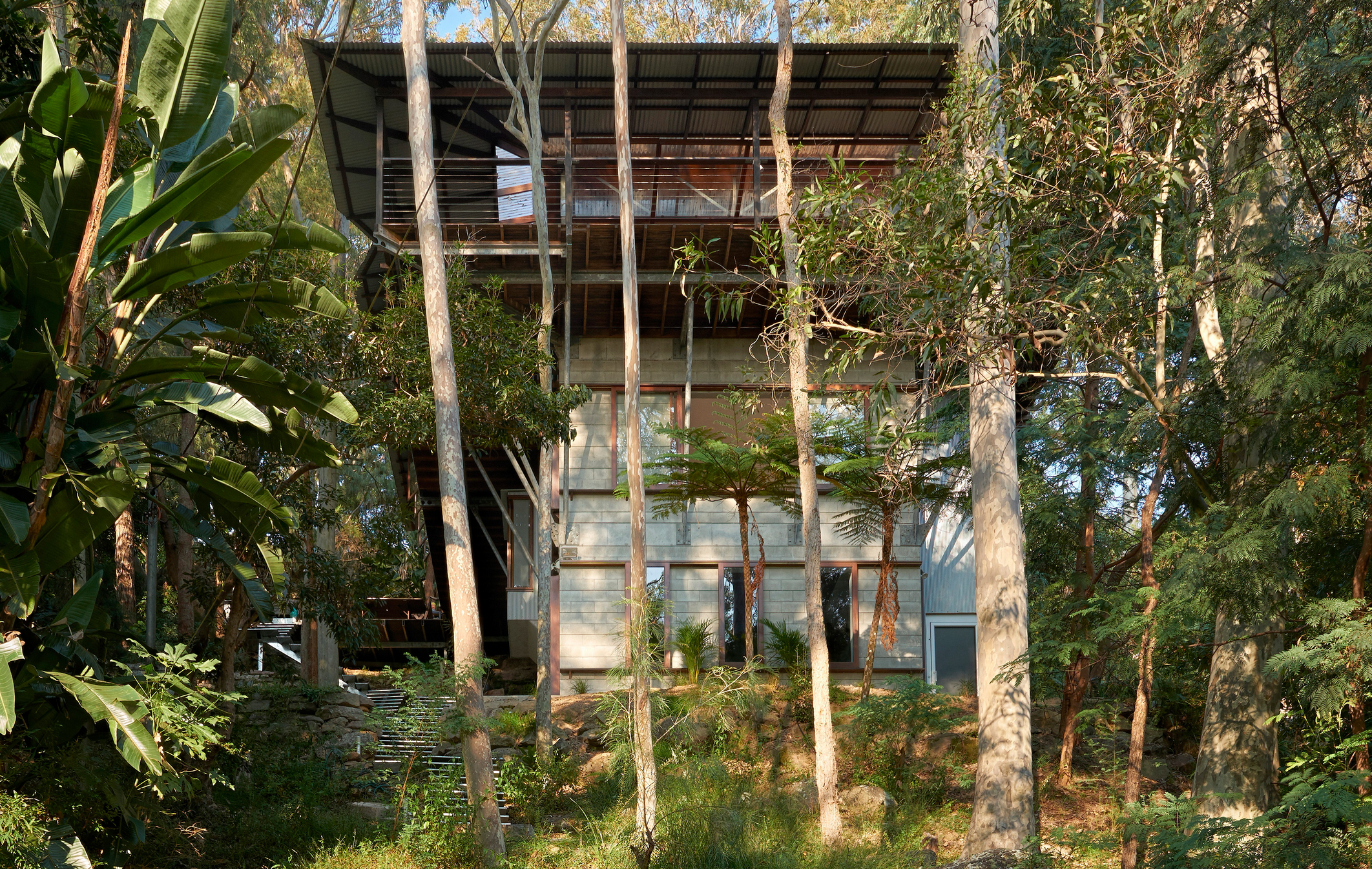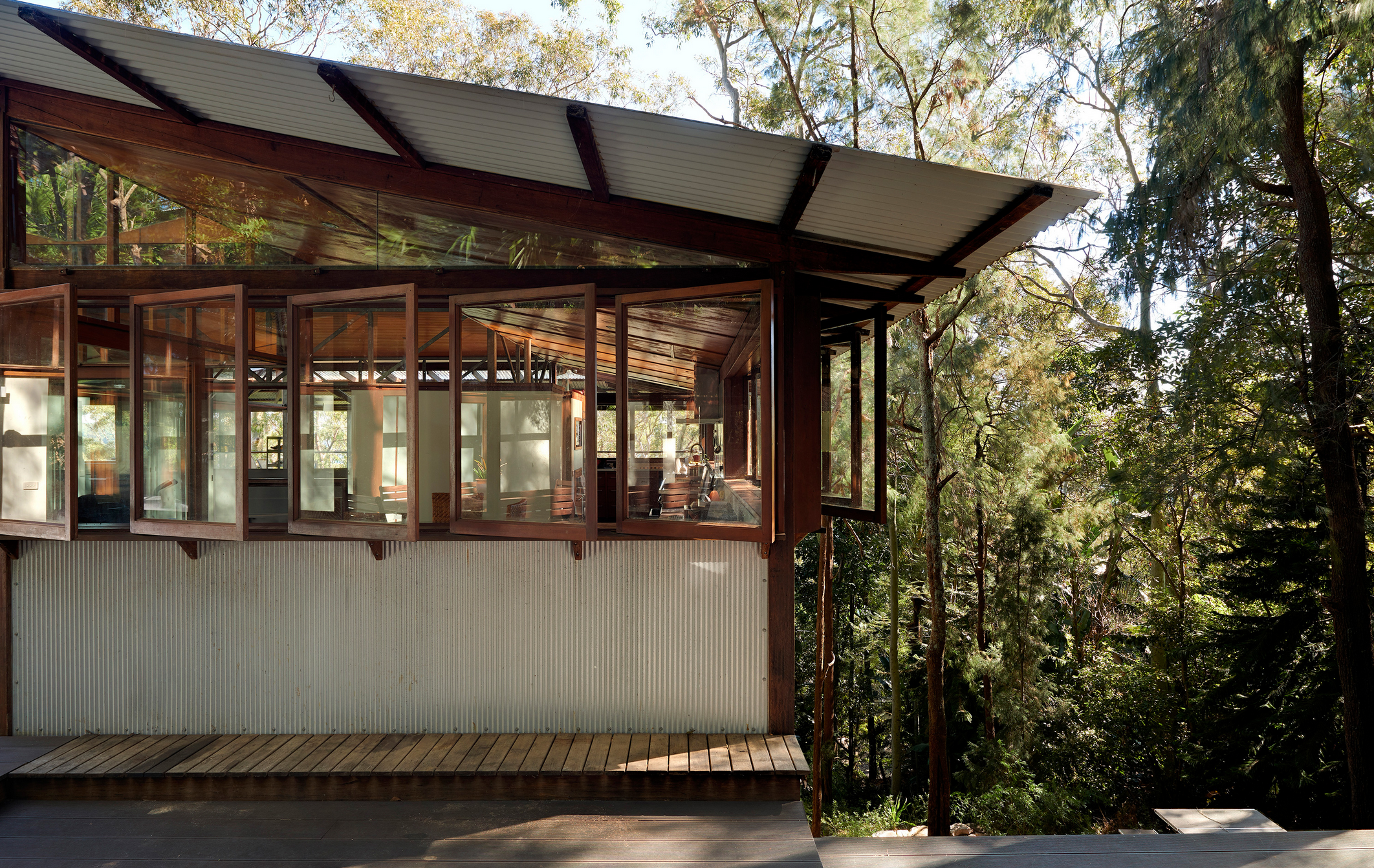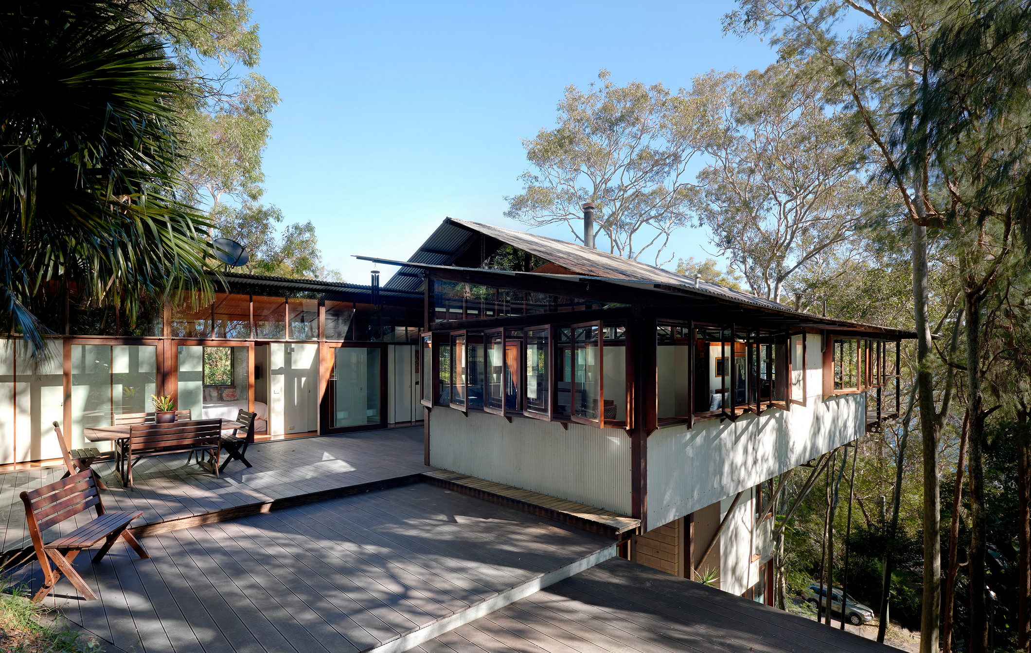 Nestled beneath a protective forest ridge, the Treetop House unfolds along a steeply sloping site in the northern Sydney suburb of Avalon Beach. The home, which is elevated on a narrow tower, emerges amidst the Spotted Gum and Casuarina trees and provides panoramic views of the nearby Pittwater estuary and bush.