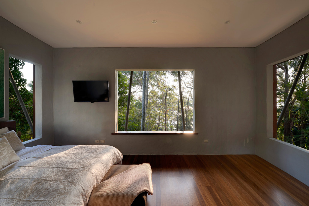The central space, which also houses the master bedroom, is lined with rich oiled tallowwood flooring, while a staircase of oiled jarrah wood provides access to each level of the home. These elements serve to counter the starkness of the white façade and interior walls while fostering an intimate dialogue with the lush Pittwater forest.
