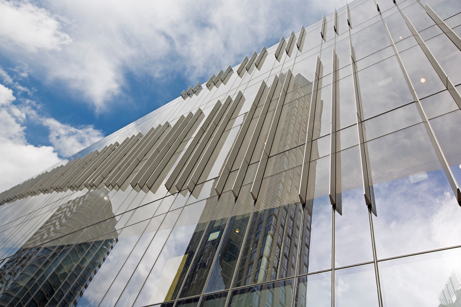 The architects aimed for the building to serve as an integrator and connector of the public spaces within and around the building. Because it is set on a triangular lot in the middle of a major arts and entertainment hub, the design team had the incentive to make the 160,000-square-foot building as distinctive and bold as possible.