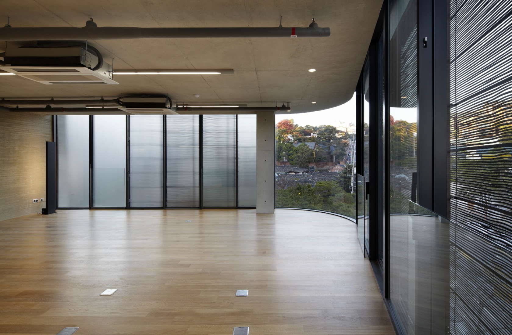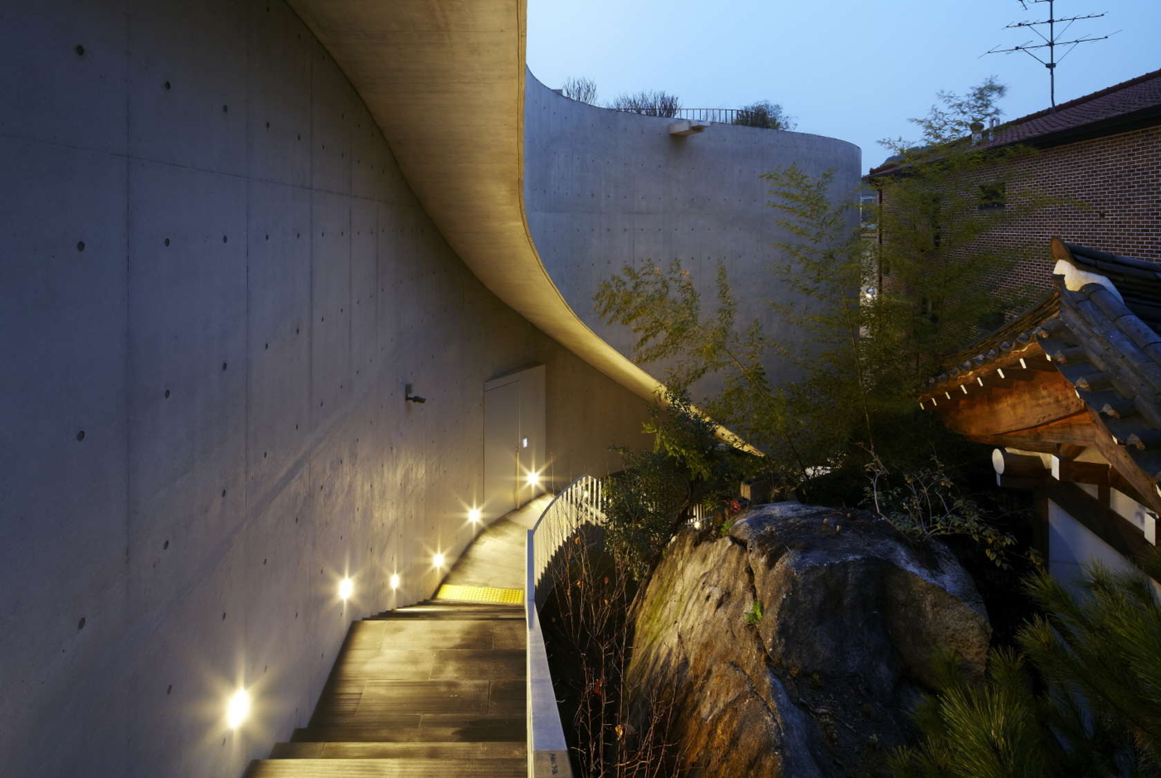 Externally, a sweeping staircase wraps around the side of the building’s Ando-esque exposed concrete walls, cast in situ with expressed tie holes and incredibly smooth finish. Sheltered between the building and the rocks of the adjacent landscape, a “vertical garden” is incorporated in the form of a dry valley that transforms into a stream during the rainy season. Natural touches are continued all the way up the building, as Chun explains: “The curvy exterior stair floats over the garden and takes visitors into the traditional Hanok roofscape and tiny mountain behind the building.”