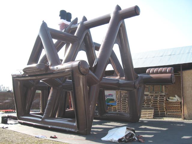 The inflatable pub breaks the mold for pneumatic structures. Usually, these kinds of projects are abstract forms that would be considered “beautiful.” The pub is basically a replica of a utilitarian structure, and not really “beautiful” at all. Secondly, the pub has a very specific function, unlike most inflatables, which are typically made for no functional purpose. They are often just installations, or they are general purpose spaces with no prescribed program.