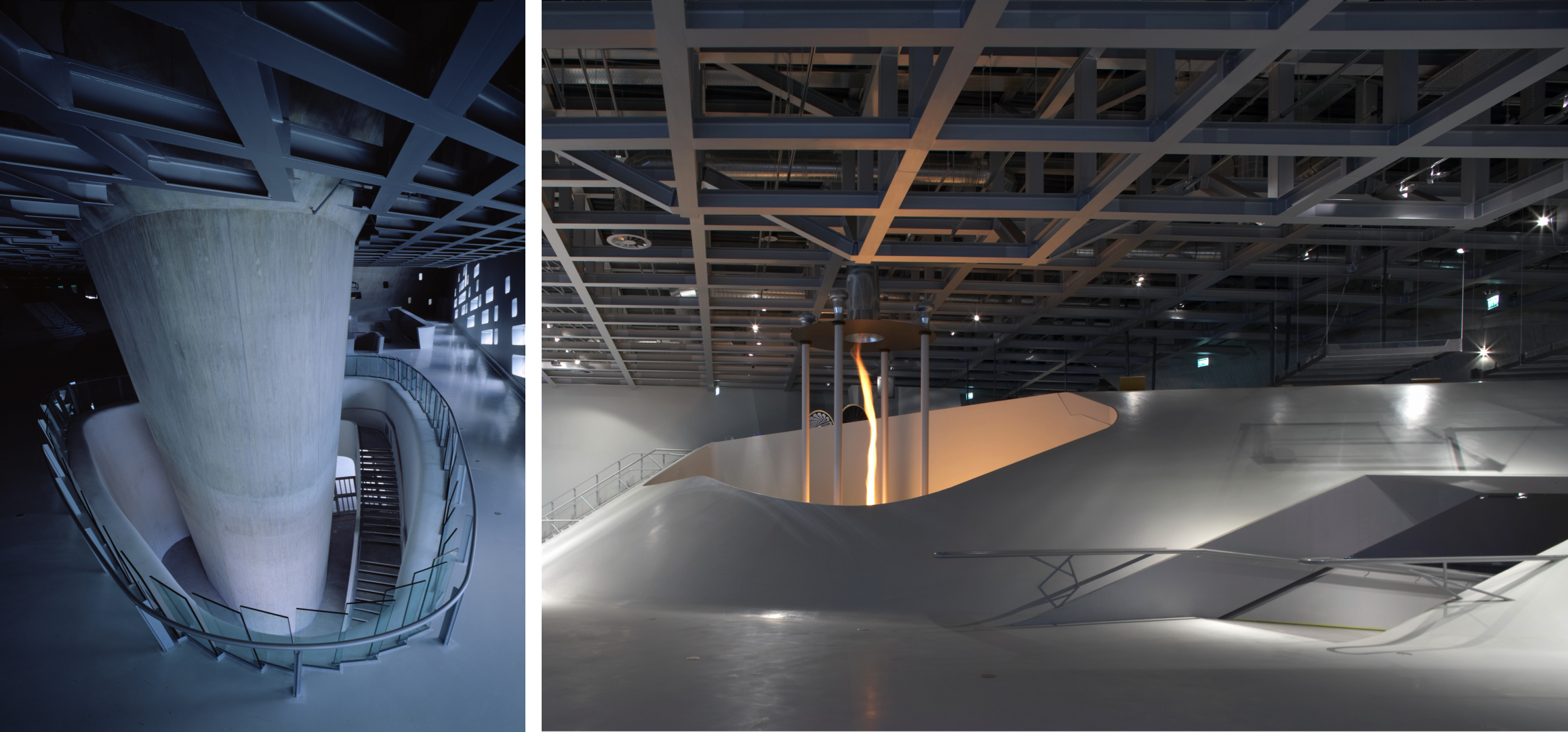 Interior of the Phaeno Science Center; (left) photo by Hélène Binet, courtesy of Zaha Hadid Architects