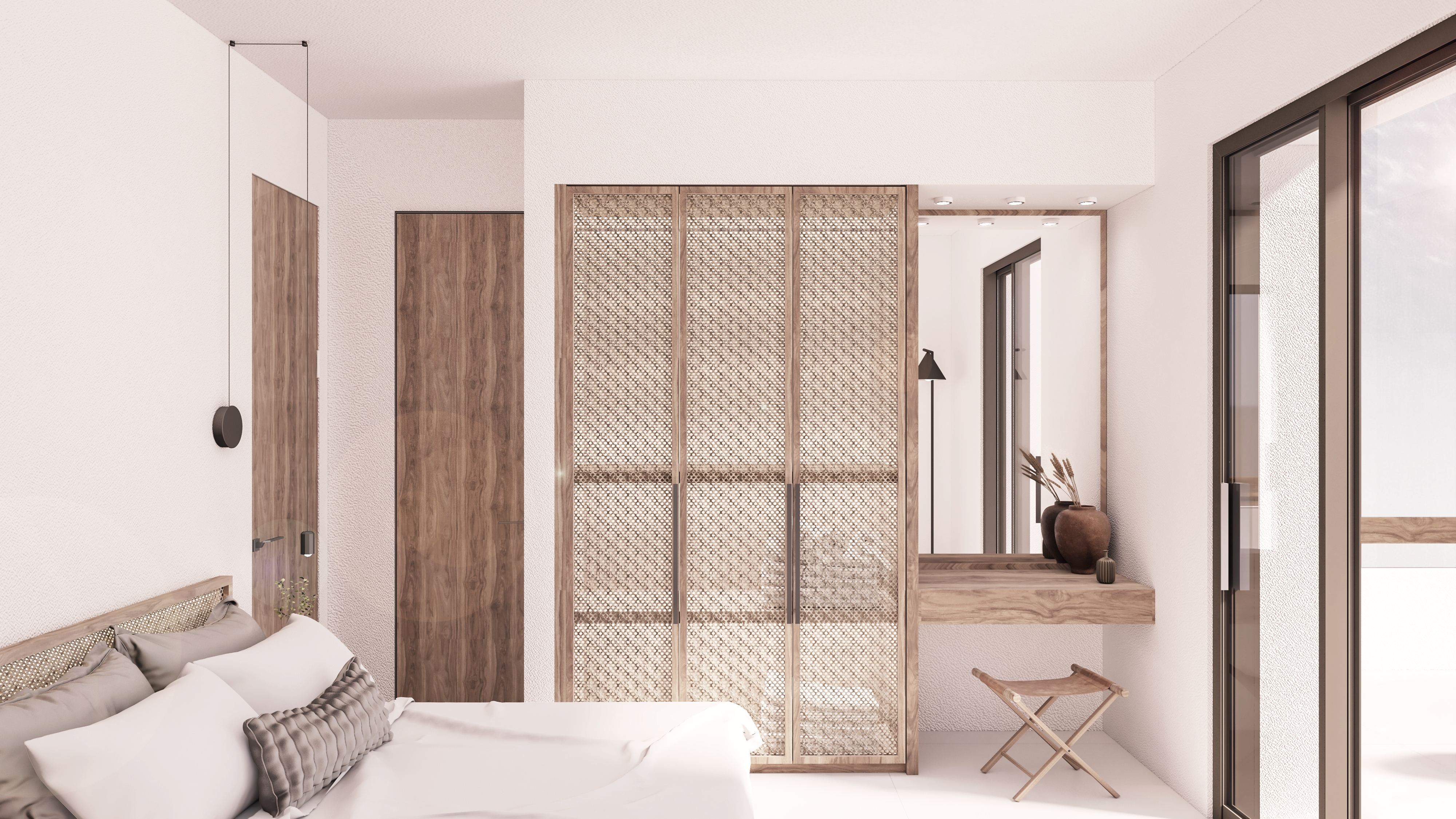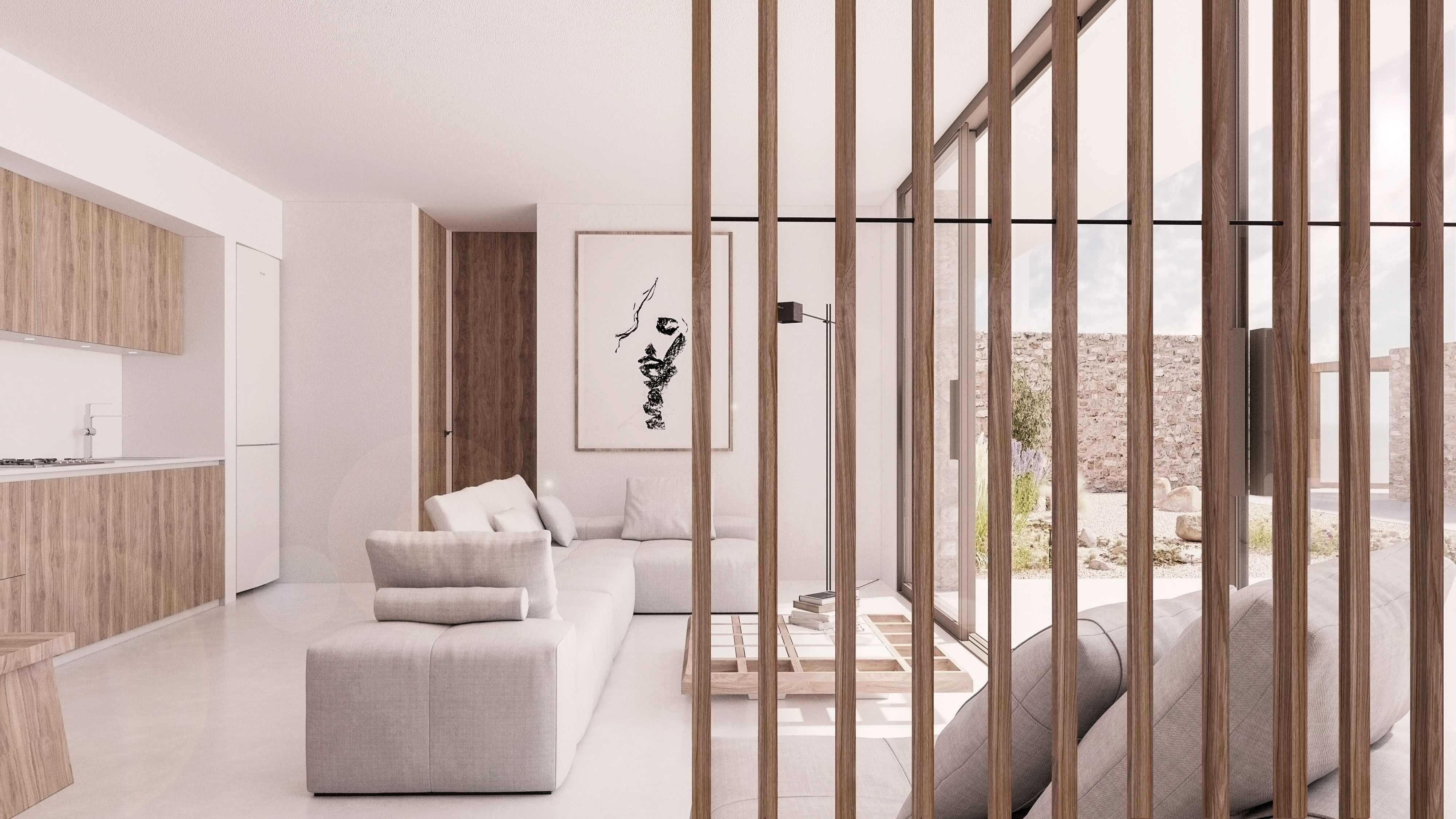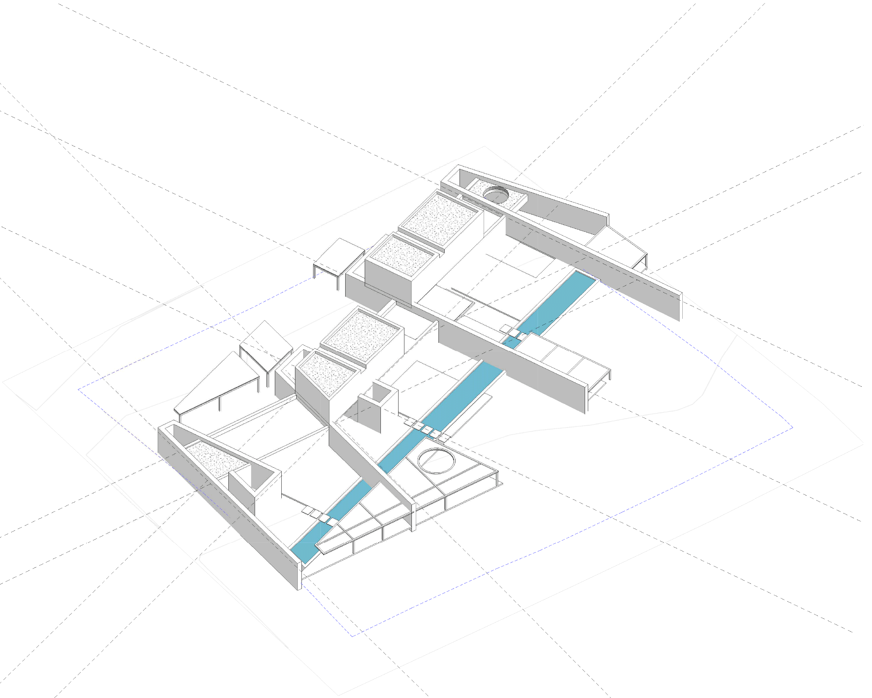 The most impressive component in this synthesis, is the element of water. We created a simple line of water, which runs through the three residences, and all the outdoor spaces are spread around it. This line represents either a film of water, or a swimming pool and creates different experiences.