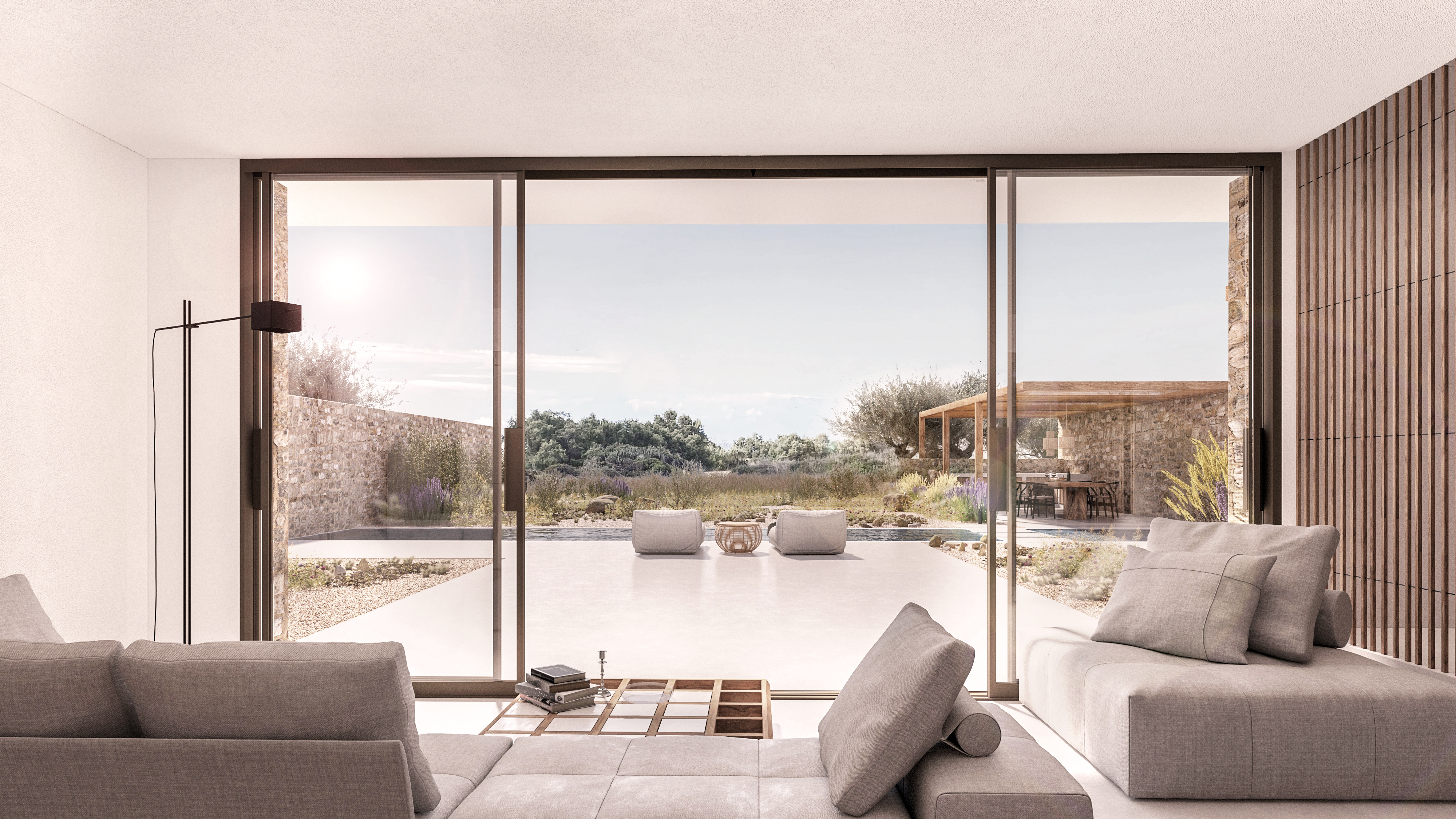 Katerina Striki- Magiaki: Both the rocky and arid Cycladic landscape and the lifestyle in Greek islands inspired us to shape forms that provide privacy and outdoor living experience. The Cycladic architecture restrictions, the view framing and the use of natural local materials were also some of our starting points.