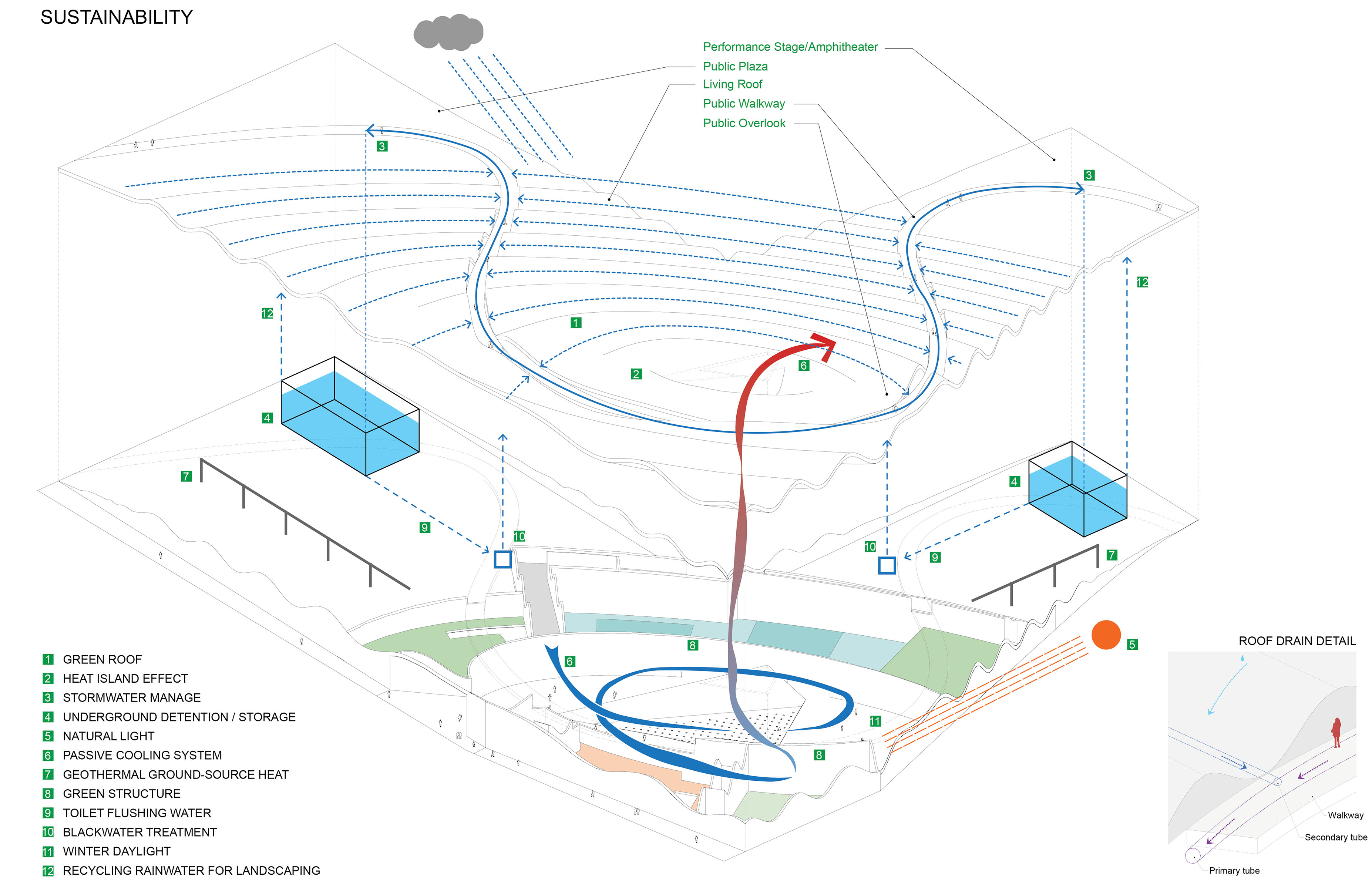 Over time, the trees grow bigger, depicting the meaning of death leading to new life. In addition to the indoor memorial space, a memorial event can be held outdoors in the garden and each tree provides an individual memorial space around. The walkway in the garden can be closed depending on the event and is used as a performance space and amphitheater. The interface along the walkway is a connection between the space and the architecture, receiving natural light, meaning that architecture and landscape are united.