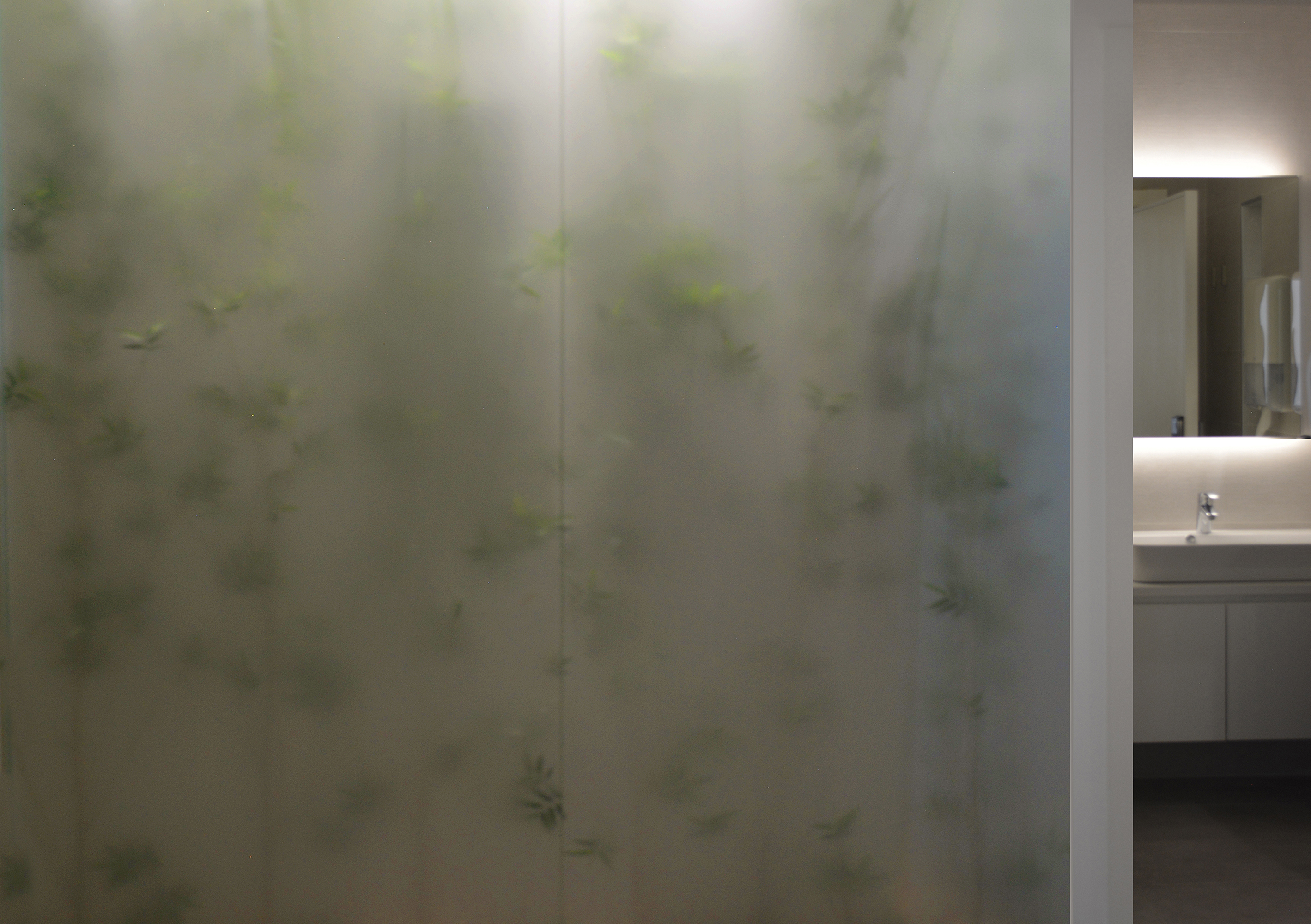 The use of translucent glass with the plantation behind and a meticulously measured light intensity was primarily conceived with the exclusive intention of adding an elusive element where one can not truly reveal what is existing behind to create an invisible depth to where it ends, and making the space looks bigger and and full of greenery.