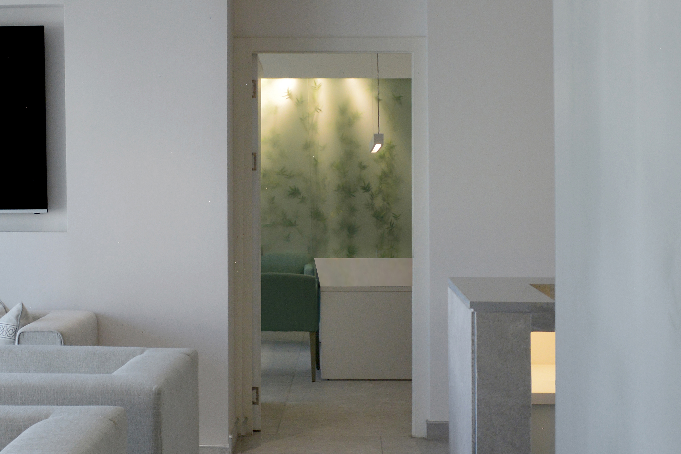 The use of translucent glass with the plantation behind and a meticulously measured light intensity was primarily conceived with the exclusive intention of adding an elusive element where one can not truly reveal what is existing behind to create an invisible depth to where it ends, and making the space looks bigger and and full of greenery