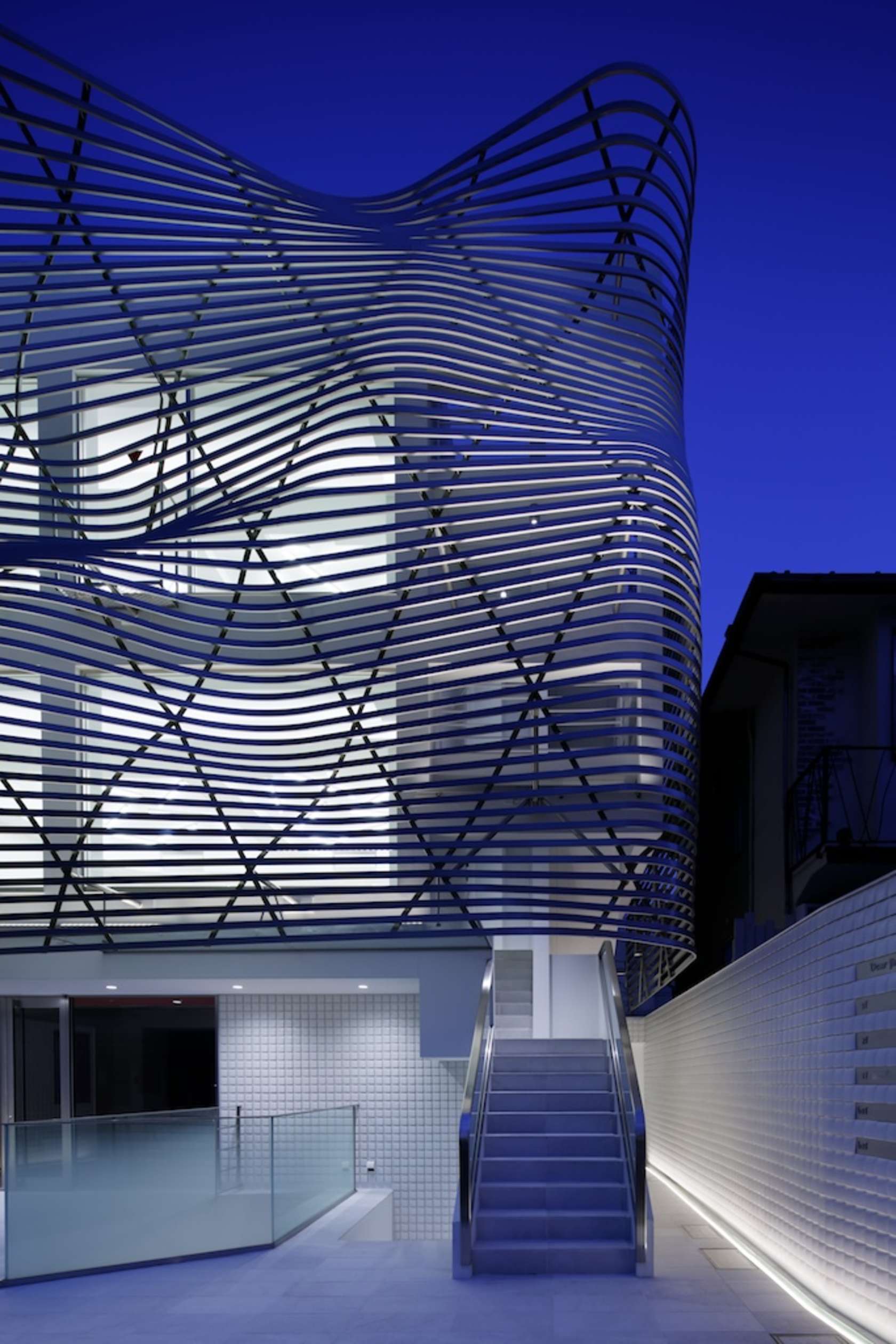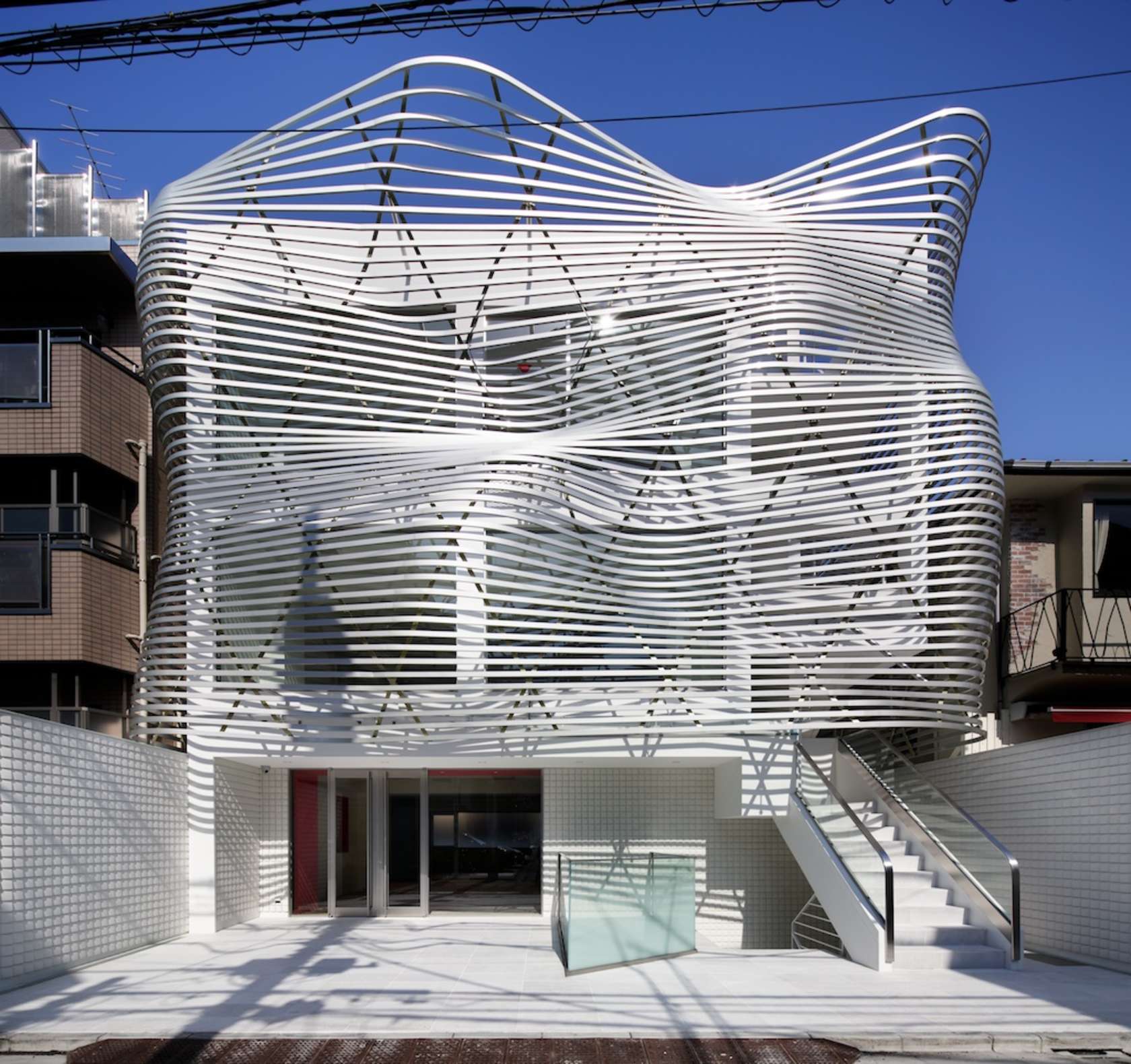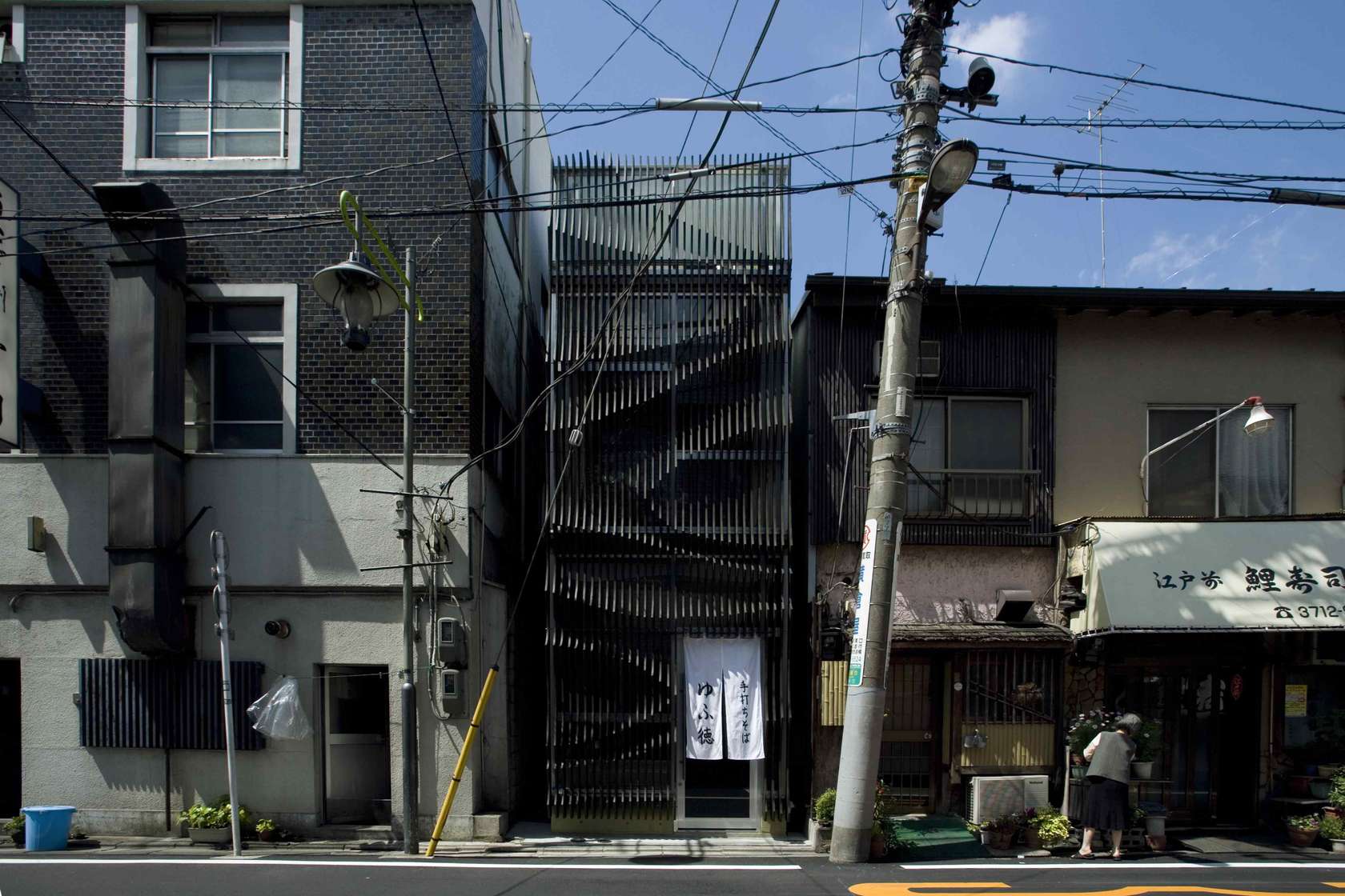 Tucked between an old store and a large apartment block, the façade of this soba noodle restaurant in central Tokyo took inspiration from traditional Japanese architecture — but with a dynamic twist. The building has Machiya-style wooden louvers, akin to a traditional townhouse, but the depth of each louver is varied to produce a striking sculptural elevation.