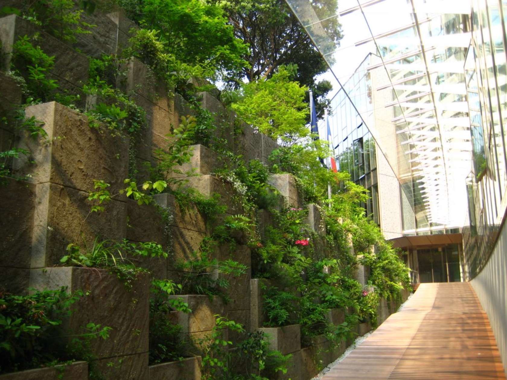 A fusion of French and Japanese landscape traditions, the atrium of this government building is home to a cascade of stone plinths and luscious green planting, in contrast to the sleek glass walls of the rest of the complex.